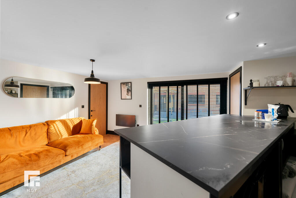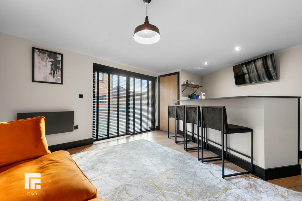 SITTINGROOM/BAR17' 7" (max)x 14' 1"(max) (5.38m x 4.31m) A spacious entertaining space with fitted bar providing space for two fridges, base unit with work tops over and stainless steel sink. Sliding patio doors to garden. Electric radiator. LVT flooring. Light and power. Door to WC.