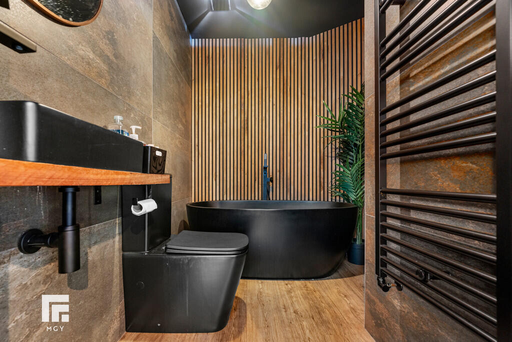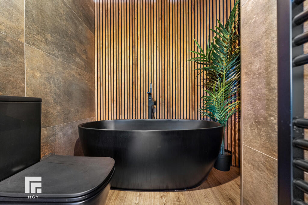 ENSUITE7' 3" x 5' 8" (max)(2.23m x 1.73m) Low level WC, modern wash hand basin and freestanding bath. Tiled and panelled walls. LVT flooring. Ladder radiator. Extractor fan.