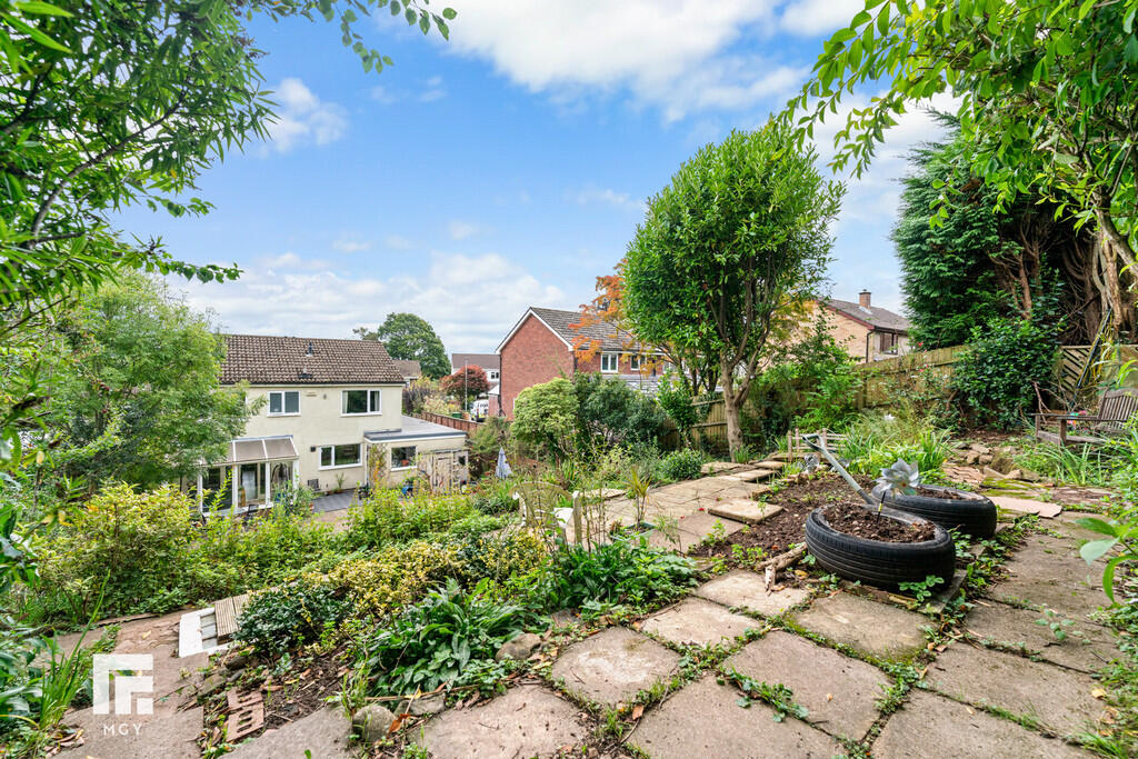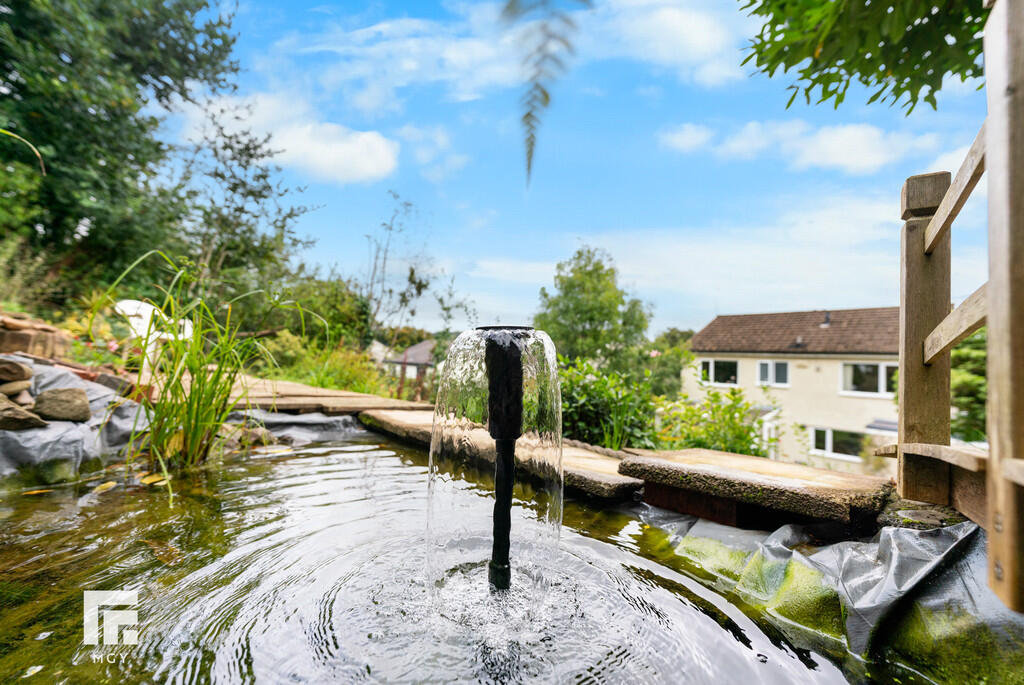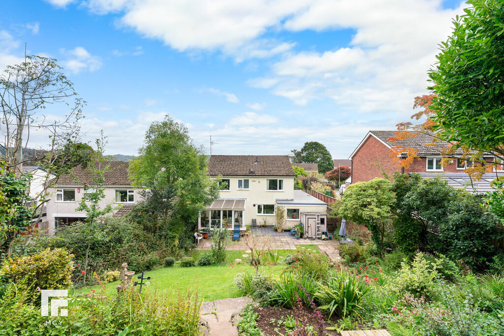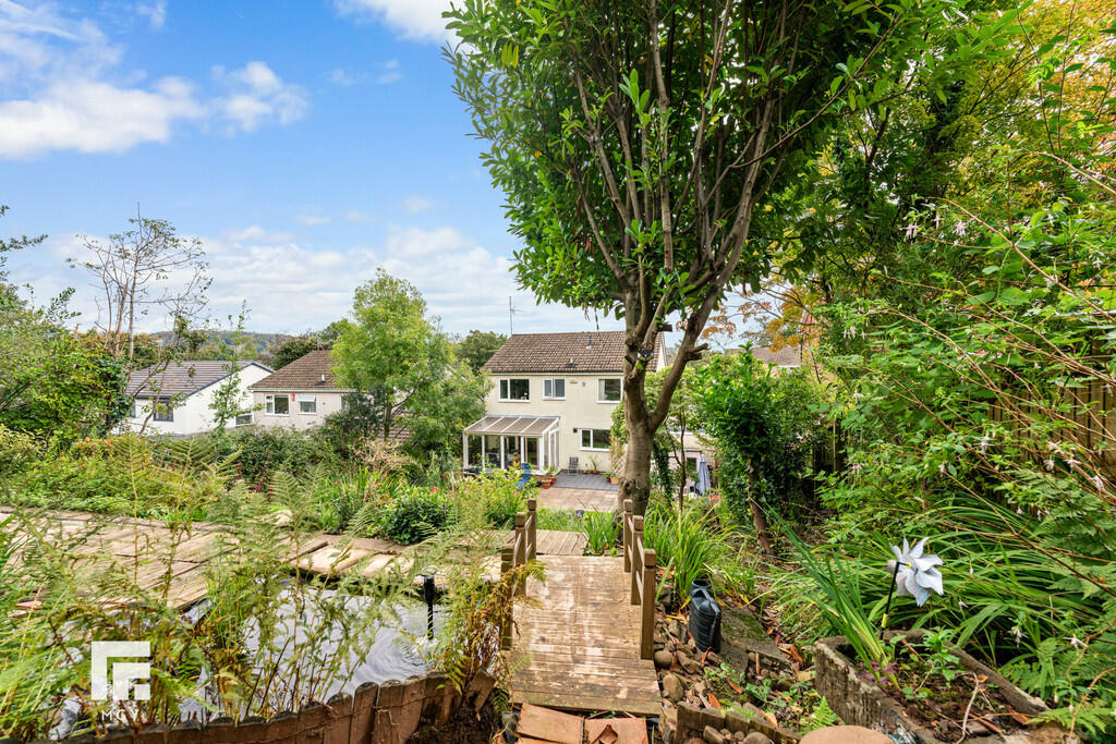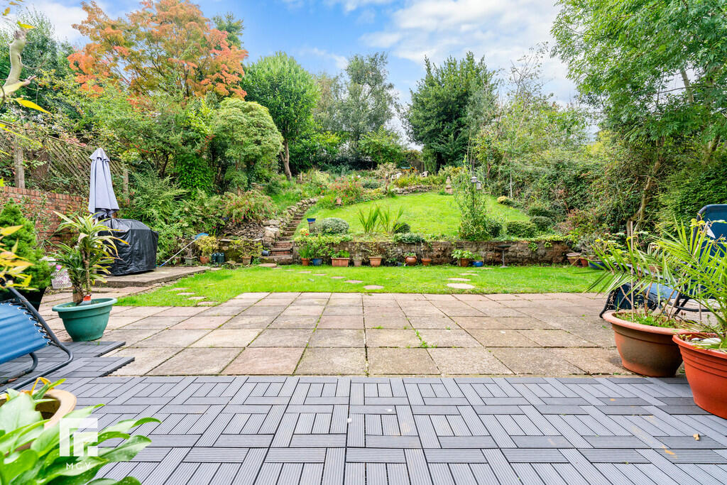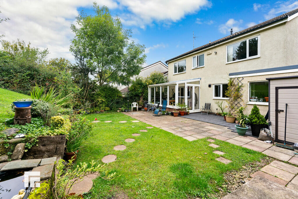 REARGARDEN An excellent sized south westerly facing rear garden comprising large paved patio leading onto tiered levels of lawns and well stocked beds of plants and shrubs. Upper relaxation. Level with pond and water feature enjoying delightful views of Castell Coch. Gate giving side access. Outside tap.