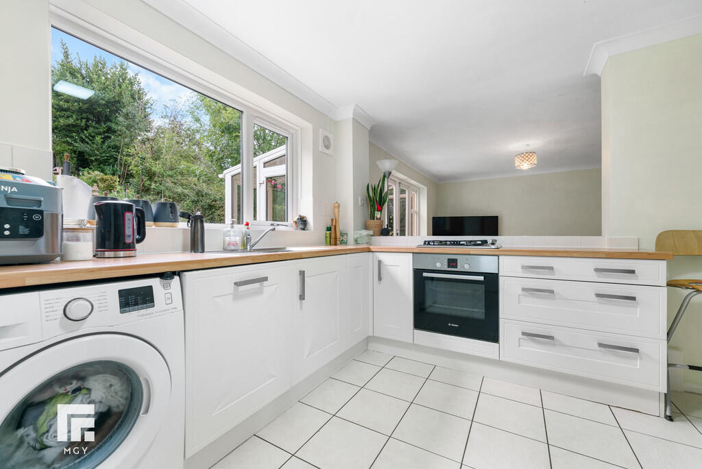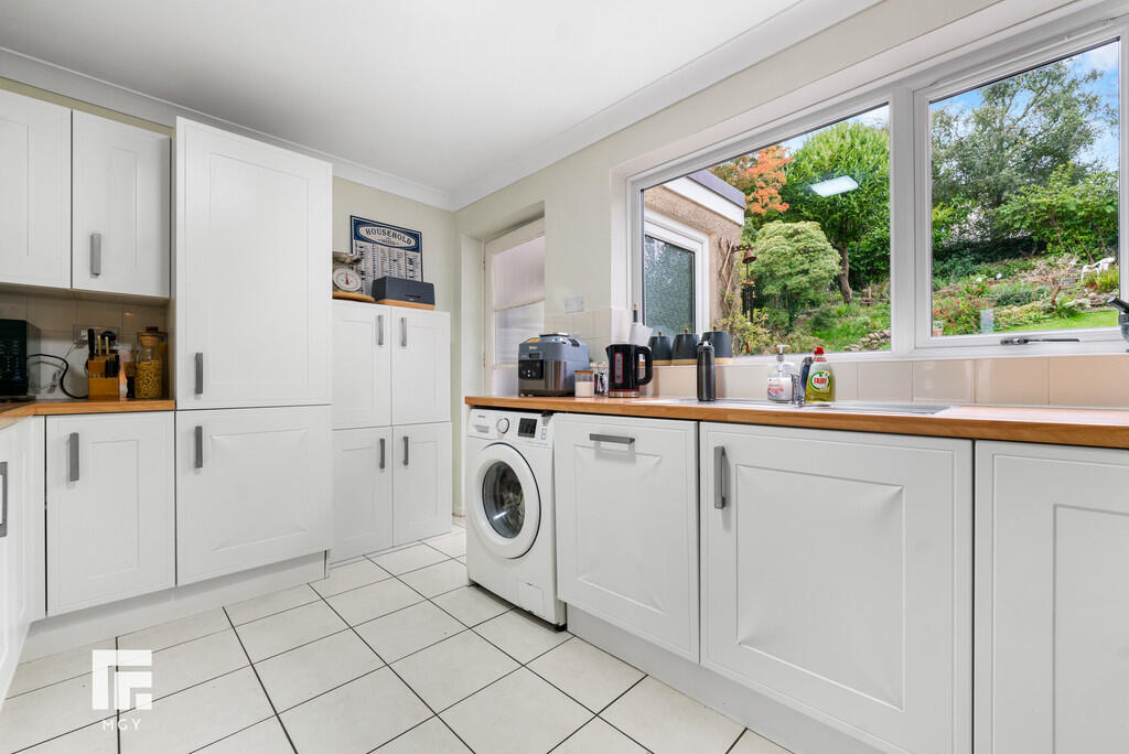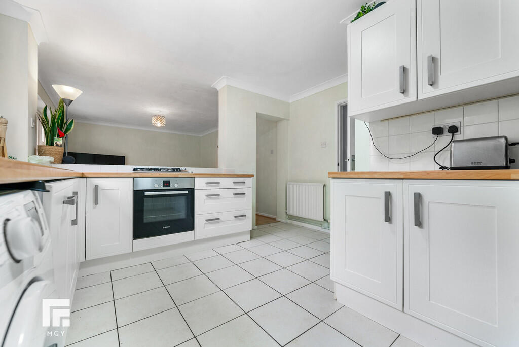 KITCHEN13' 2" x 11' 10" (4.03m x 3.62m) With light panelled fronts appointed along four sides and work surface above. Inset stainless steel sink with side drainer. Inset four ring gas hob with oven below. Integrated dishwasher. Plumbing for washing machine. Integrated fridge/freezer. Tiled flooring. Tiled splash back. Open to the sitting room. Door to rear lobby. Under-stairs storage cupboard.
