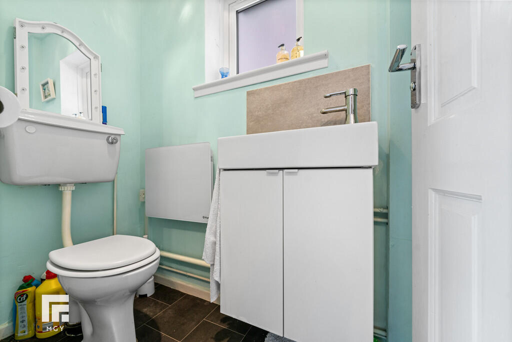 CLOAKROOM White suite comprising low level wc, vanity wash basin with storage below. Window to side. Electric radiator.