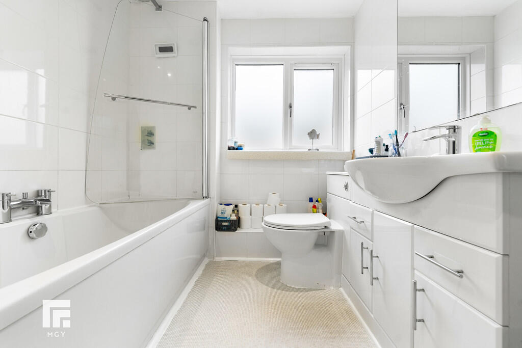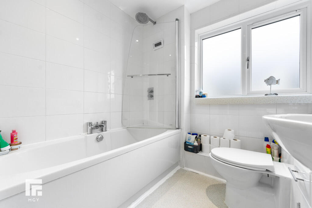 FAMILYROOM8' 7" x 6' 7" (2.63m x 2.03m) Modern white suite comprising low level wc, vanity wash basin with storage below. Panelled bath with central taps and shower above. Full wall tiling. Obscured glass window to rear. Chrome heated towel rail.