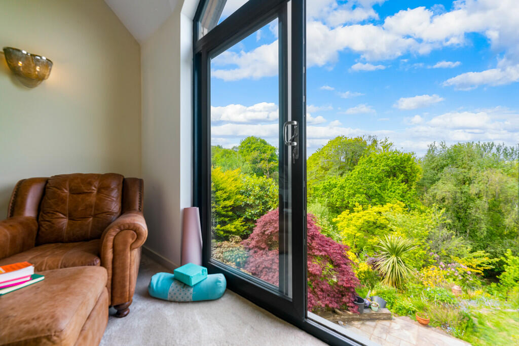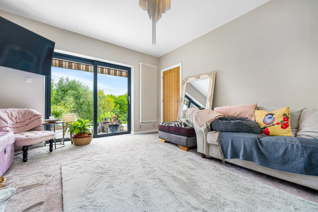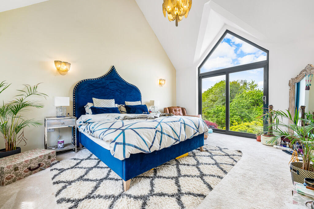 BEDROOMONE16' 3" x 12' 11" (4.96m x 3.96m) An exceptional principal bedroom with high vaulted ceiling, patio doors opening to a Juliet balcony and enjoying views over the rear garden and beyond, additional window to other side, radiator, door to dressing room and ensuite.