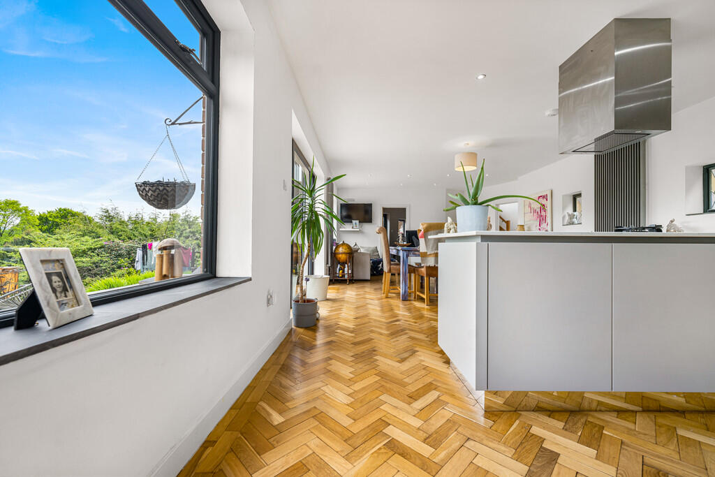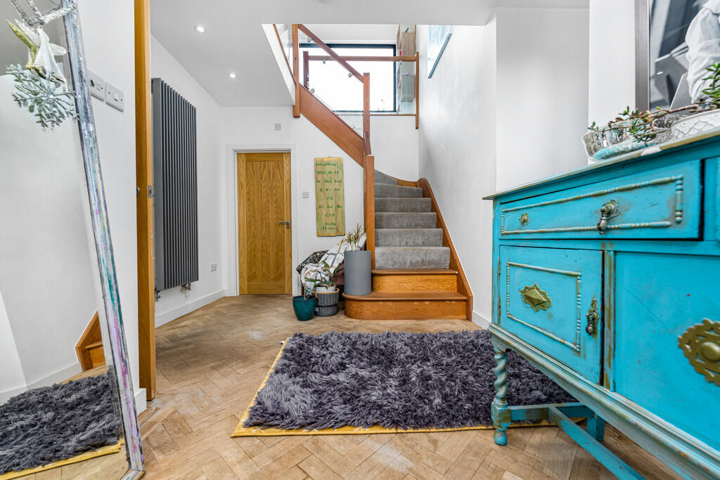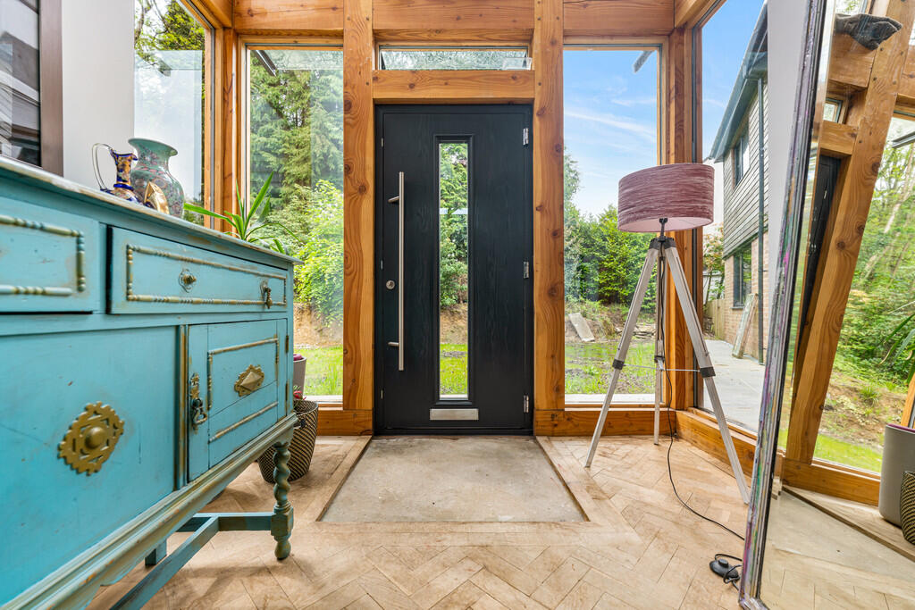 HALLWAY17' 3" x 9' 3" (5.26m x 2.84m) A beautiful, double height, soiled oak constructed with double glazed windows and feature vaulted ceiling. Entered via double glazed composite front door. Parquet wood flooring. Turning staircase to first floor with glass panelling and oak banister. Oak doors to kitchen/dining/family room, studio/bedroom, hobby room/study and WC/Shower Room. Two modern column radiators. Spotlights.
