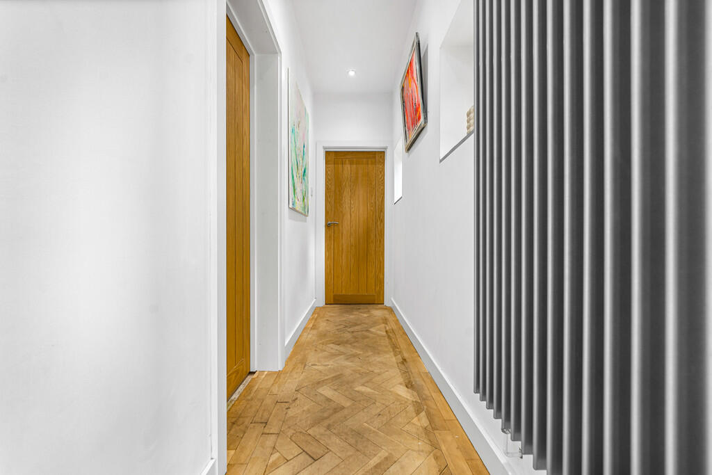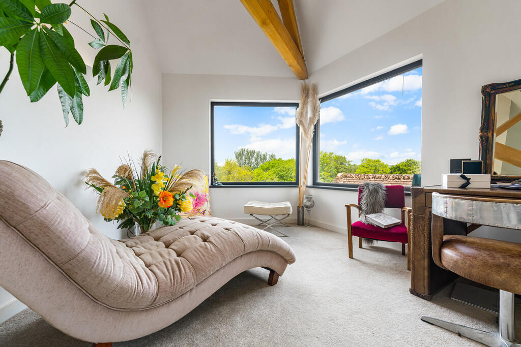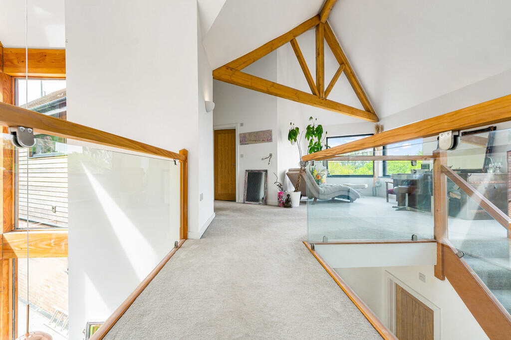 FIRSTFLOORLANDING24' 2" x 16' 3" (7.39m x 4.97m) Approached via a natural wood staircase with glass panels leading to the exceptionally spacious first floor landing with tall vaulted ceiling and natural exposed beam, enjoying lovely open views through many windows giving an impression of an open woodland setting, galleried landing area overlooking the entrance hallway, two radiators. Doors to all rooms.