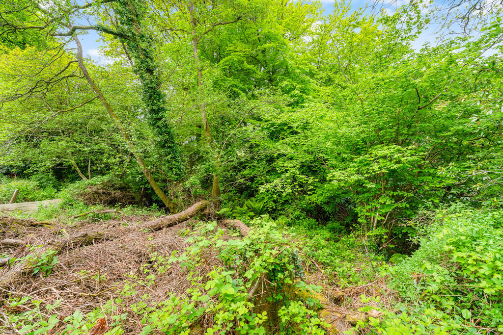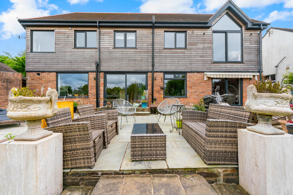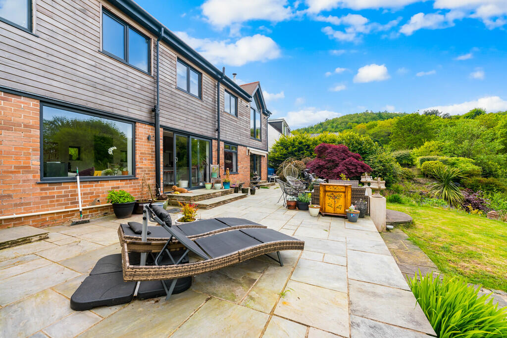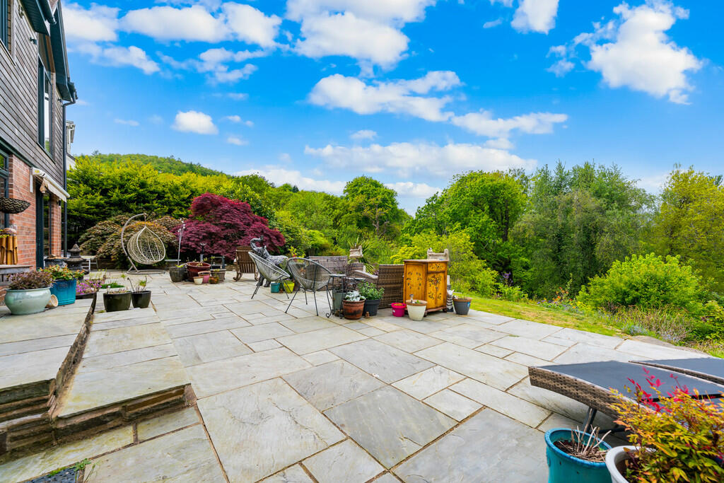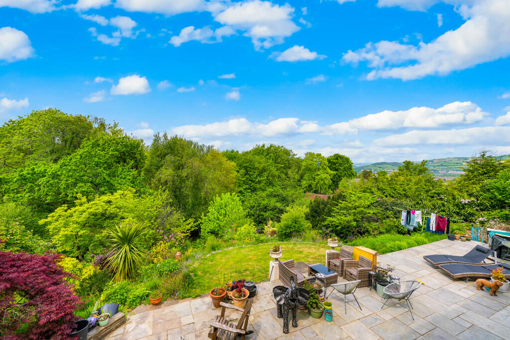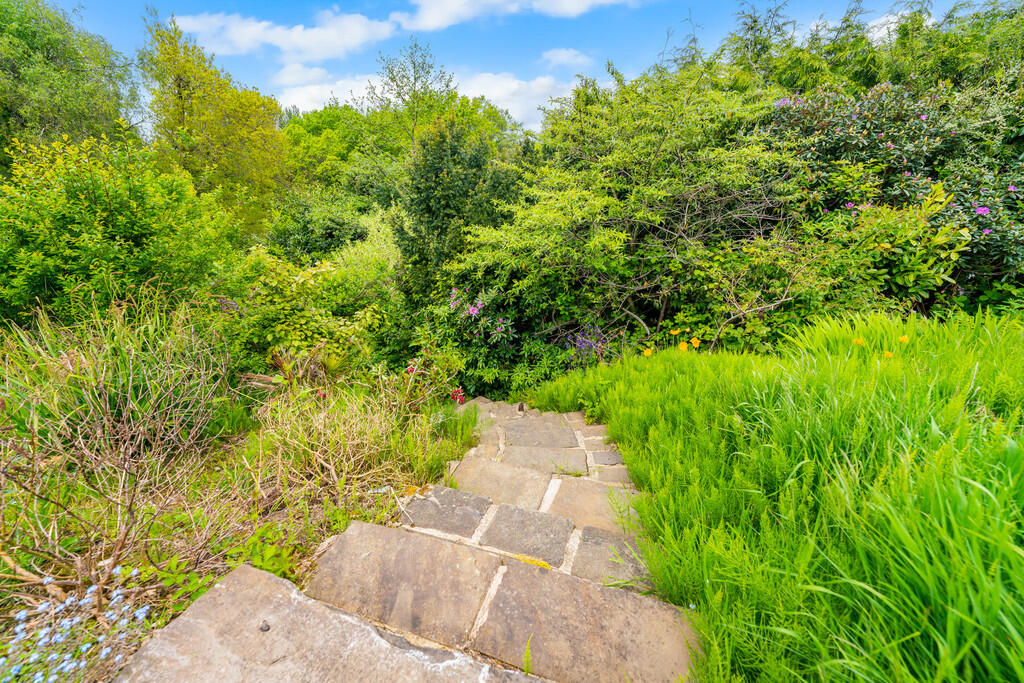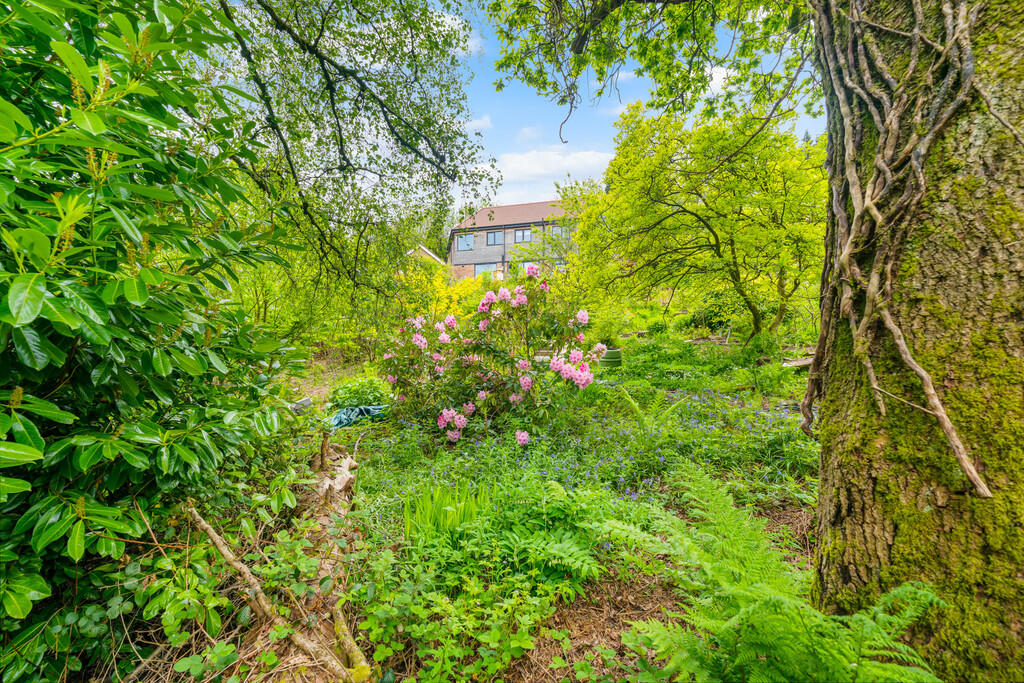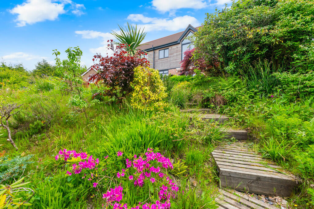 OUTSIDE-REARGARDEN A delightful, South facing rear garden enjoying a serene setting with large paved patio leading onto an area of lawn and steps down to beds of pants, shrubs and maturing trees leading down to a further level area with potential for home allotment or building of a home office or garden room (subject to planning). Towards the end of the plot is a stream and further land beyond which adjoins the golf course.