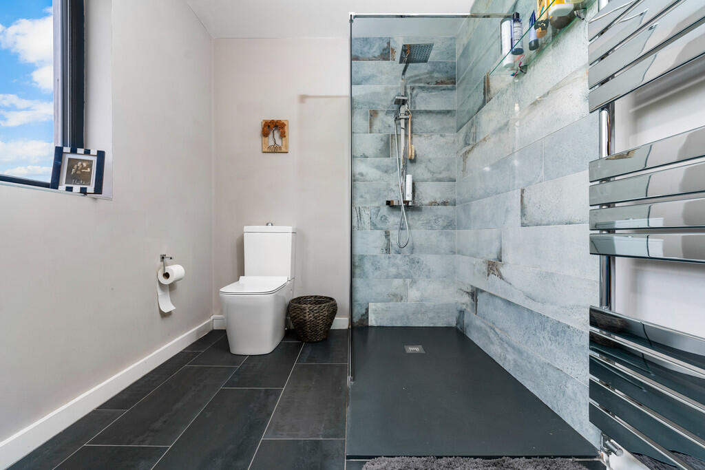 WC/SHOWERROOM9' 2" x 6' 6" (2.80m x 1.99m) max A stylish suite to include low level WC, wash hand basin with slate worktop and walk-in shower with glass screen, rainfall shower head and separate handheld attachment. Tiled splash backs. Ladder radiator. Double glazed window to side. Spotlights and extractor fan. Large under stair storage cupboard.