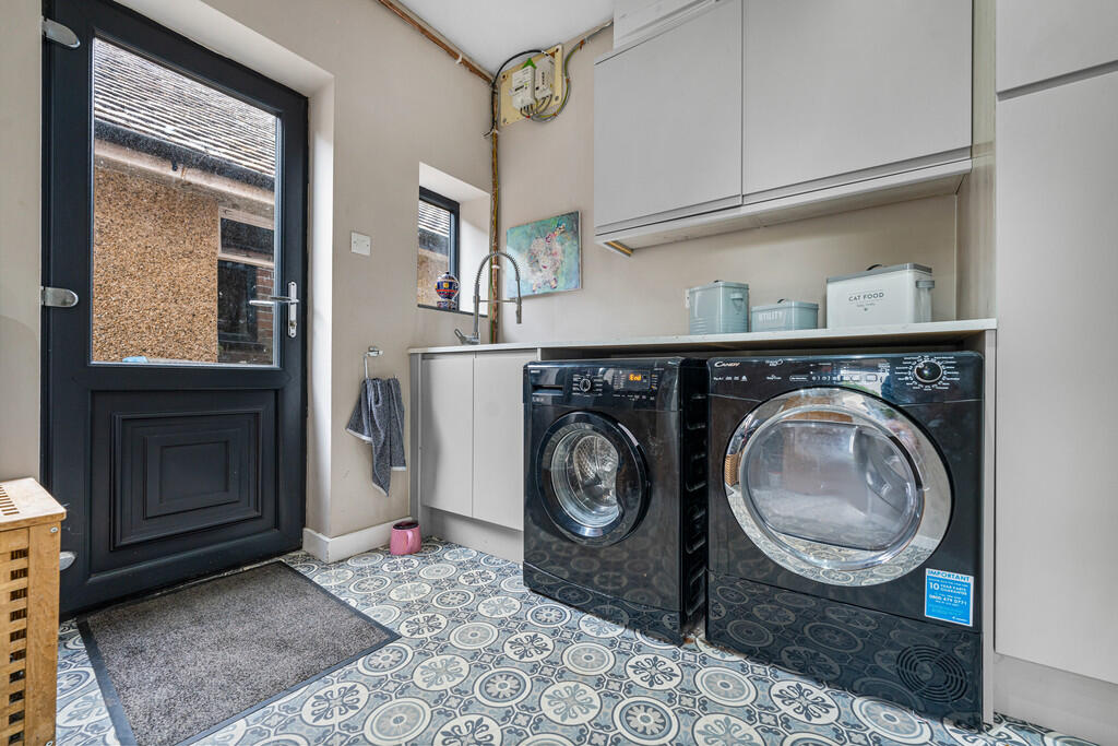 UTILITYROOM10' 8" x 8' 5" (3.27m x 2.58m) Modern base and eye level units incorporating stainless steel sink with complementary work surfaces. Space for washing machine and tumble dryer. Two double glazed windows to side. Wall mounted gas central heating boiler. Spotlights. Double glazed composite external door to side.