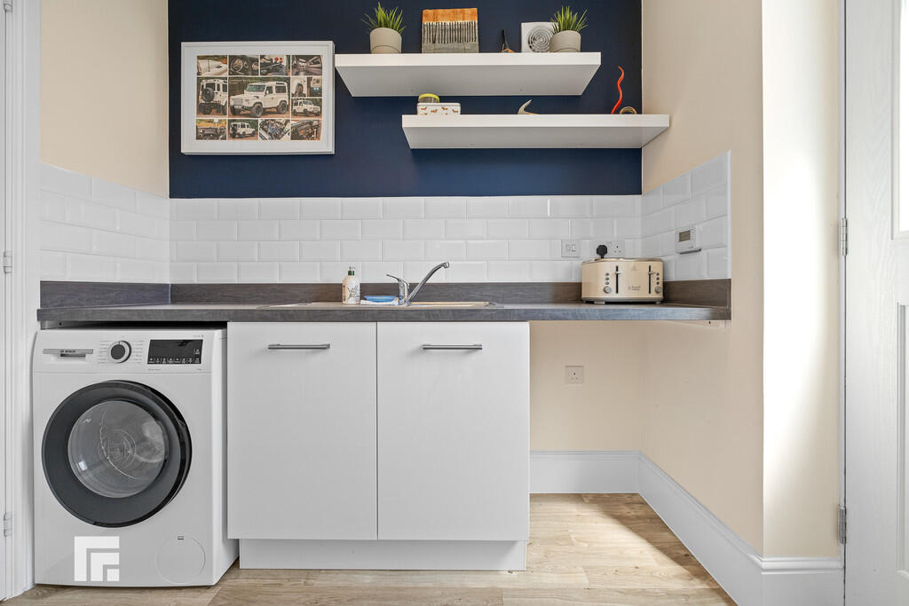 UTILITYROOM7' 6" x 5' 8" (2.30m x 1.74m) With units and worktops to one side. Inset stainless steel sink with side drainer. Plumbing for washing machine. Space for tumble dryer. Tiled splash back. Door to rear garden. Radiator. Door to cloakroom.