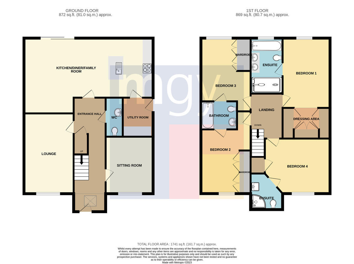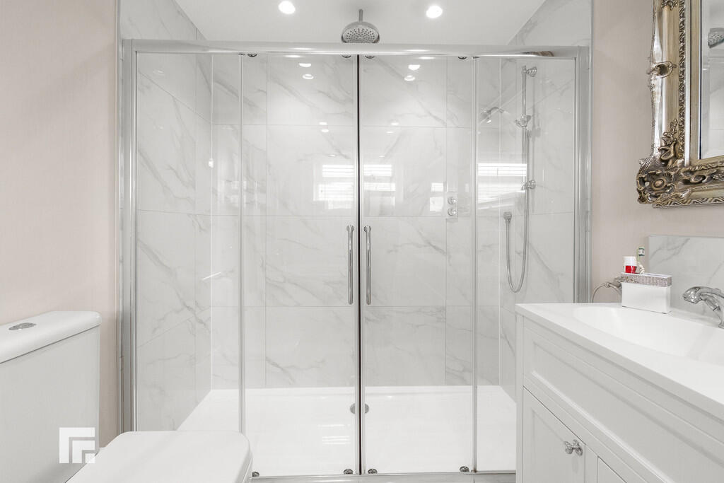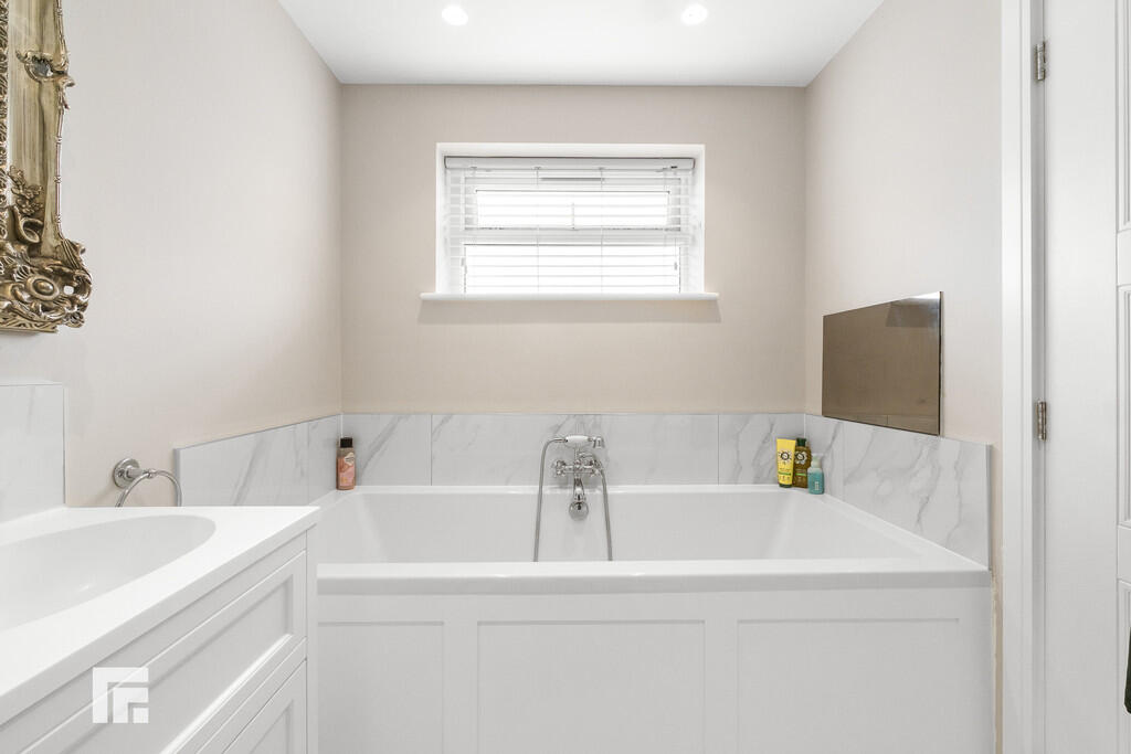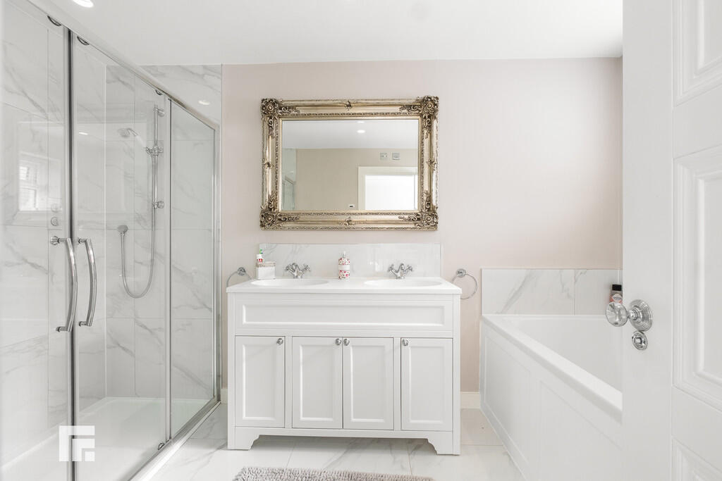 ENSUITE11' 3" x 6' 4" (3.43m x 1.95m) A beautiful suite comprising low level WC, large shower cubicle with rain shower head, separate handheld attachment and glass doors. Vanity unit with double basin and large panelled bath with shower attachments. Wall mounted tv/mirror. Tiled flooring with underfloor heating. Tiled splash backs. Spotlights.