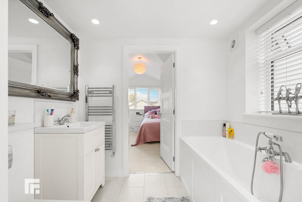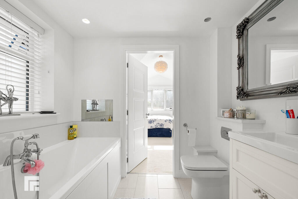 JACKANDJILLBATHROOM7' 6" x 5' 9" (2.30m x 1.76m) Another tastefully designed suite to include low level WC, vanity enclosed wash hand basin and panelled bath with shower attachment. Tiled flooring and splash backs. Spotlights and extractor fan. Ladder radiator. uPVC double glazed window to side.