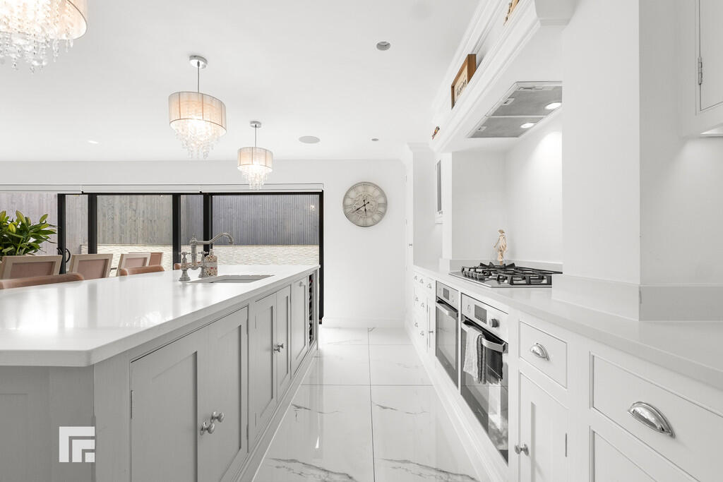 KITCHEN/FAMILY/DININGROOM28' 0" x 15' 4" (8.55m x 4.68m) An exceptional family space with feature three leaf double glazed sliding doors to rear garden. The kitchen is fitted with a wide range of base, eye level and full height units. Central island/breakfast bar incorporating one and a half bowl sink with complementary Quartz work surfaces. Integrated dishwasher. Two electric ovens and gas hob with extractor fan over. Porcelain tiled flooring with underfloor heating. Spotlights. Built-in ceiling speakers. Door to utility room.