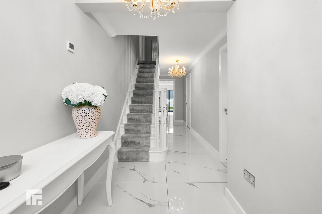HALLWAY22' 11" x 6' 5" (7.00m x 1.98m) Entered via double glazed composite front door into hallway. Feature vaulted ceiling with window to front and velux window to side. Staircase rising to first floor with built in storage under. Porcelain tiled flooring with underfloor heating. Opening to kitchen/dining/family room, doors to lounge, study/sitting room and WC. Storage cupboard.