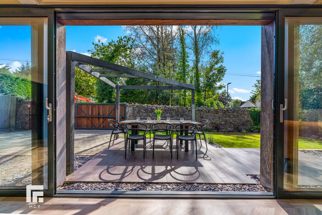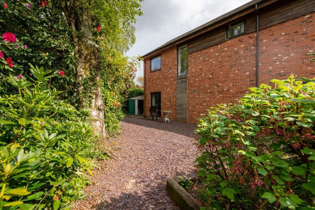 FRONTGARDEN Wide paved driveway approached via automated wooden/steel gate (with mobile phone enabled intercom) leading onto an area of lawn with tile paved relaxation area and feature pergola. Plants and shrubs to borders with additional area of loose slate chippings, stone brick wall to front boundary, timber gate to side leading to rear garden. The front garden enjoys a southerly aspect.