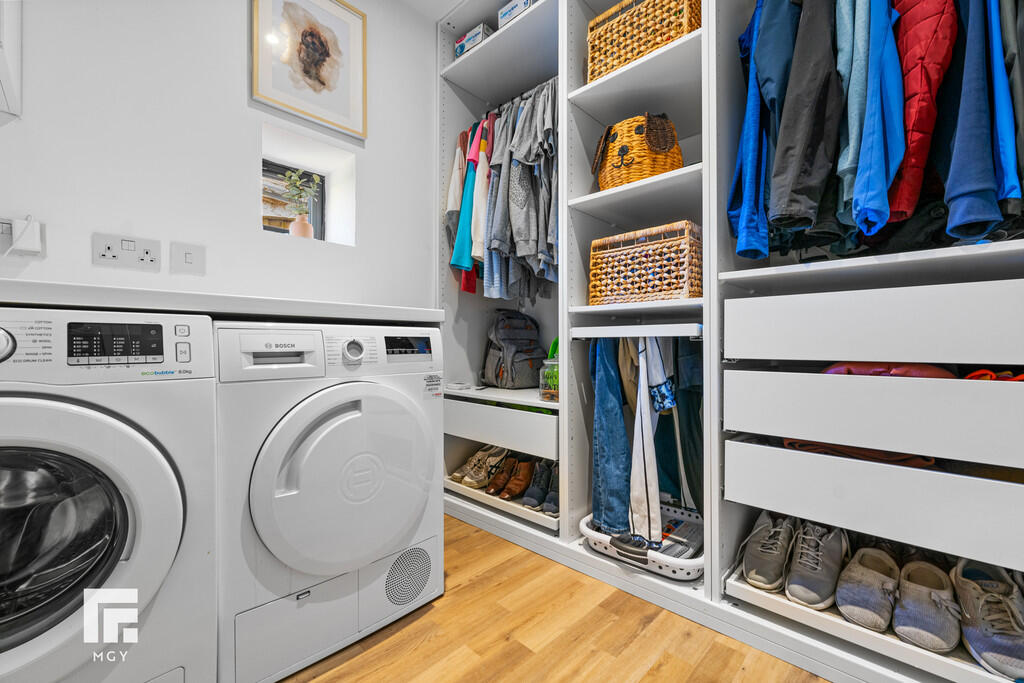 UTILITYROOM Plumbed for washing machine and tumble dryer, with work top over. Fitted cloaks unit. LVT flooring. Spotlights. Double glazed window to side. Towel radiator. Under floor heating. Door to cloakroom.