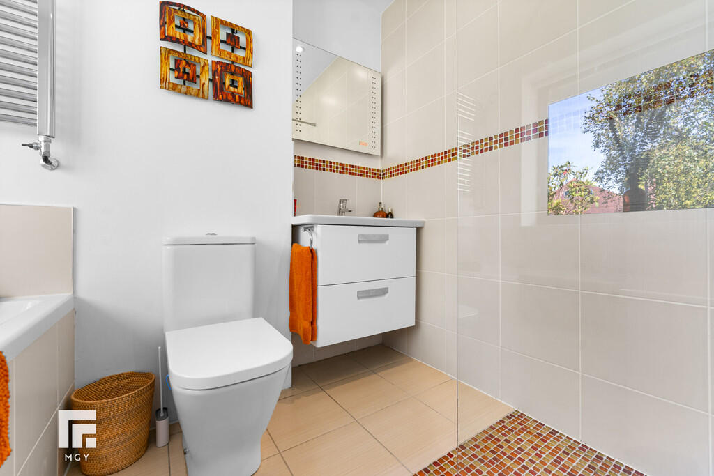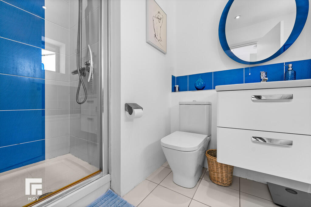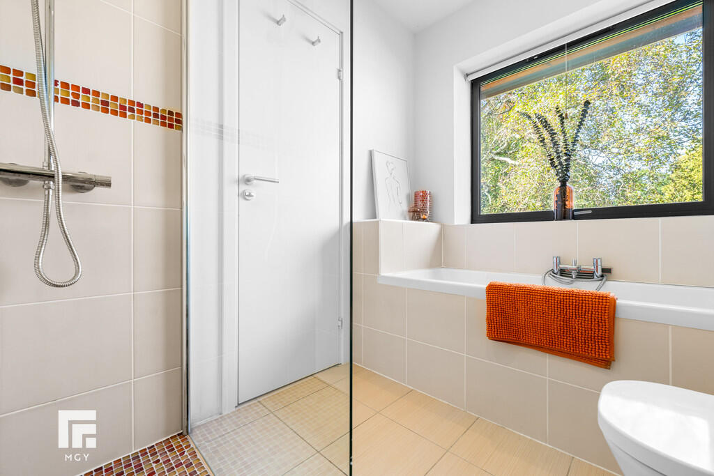 ENSUITE Modern white suite comprising low level wc, vanity wash basin with storage below, bath with shower mixer tap, window to rear, shower cubicle with chrome twin head shower, wall tiling to splash back areas, tiled flooring.