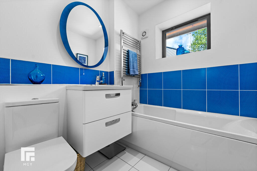 FAMILYBATHROOM Quality white suite comprising low level wc, vanity wash hand basin with storage below, panelled bath with shower mixer tap, shower cubicle with twin headed shower, chrome heated towel rail, wall tiling to splashback areas, tiled flooring and window to rear.