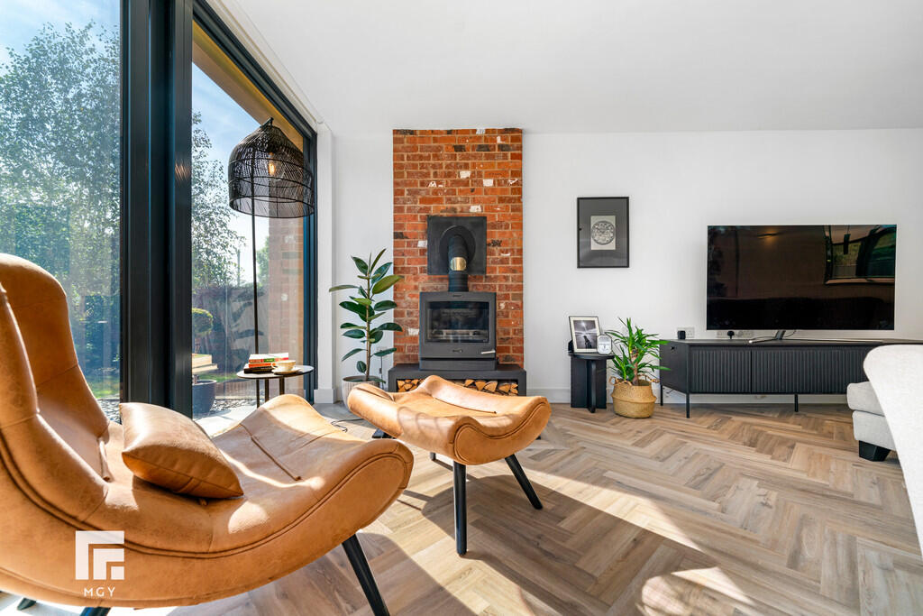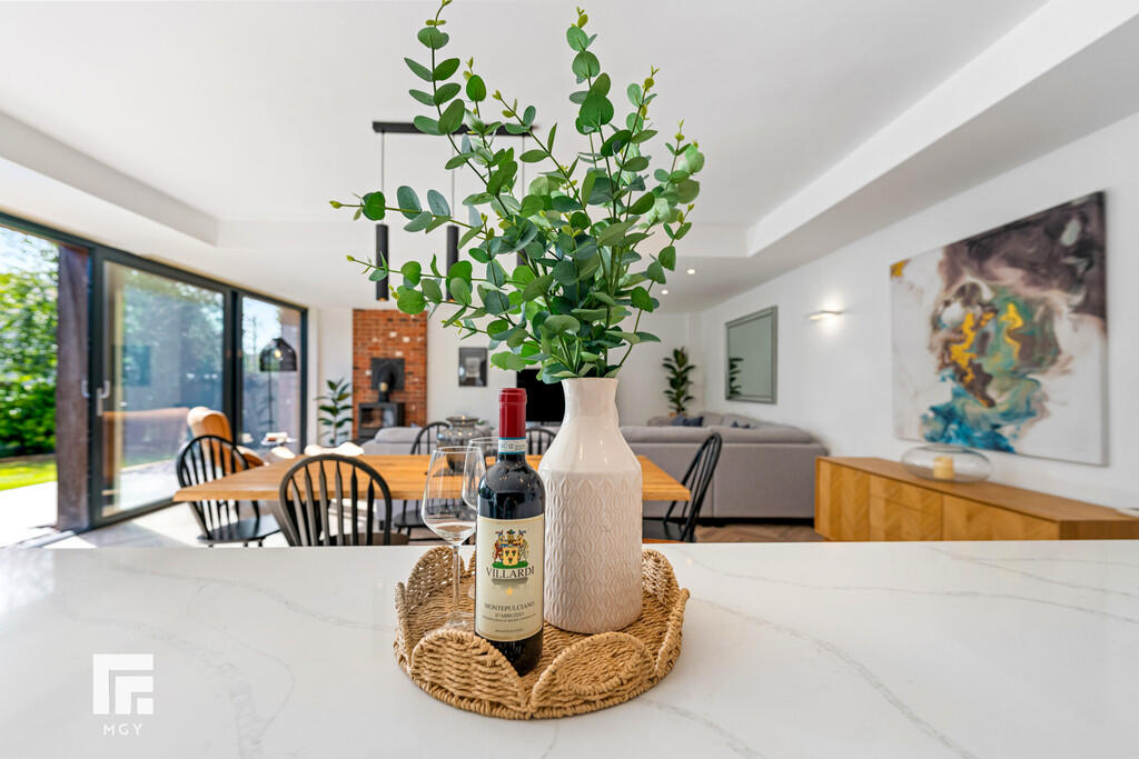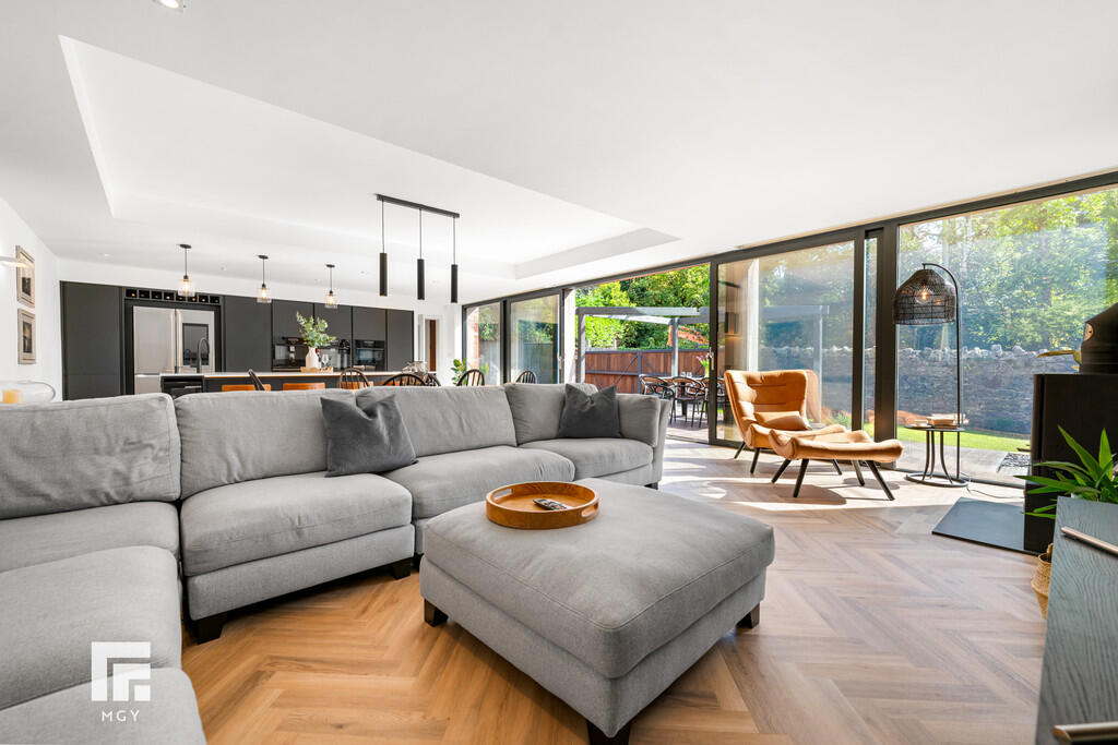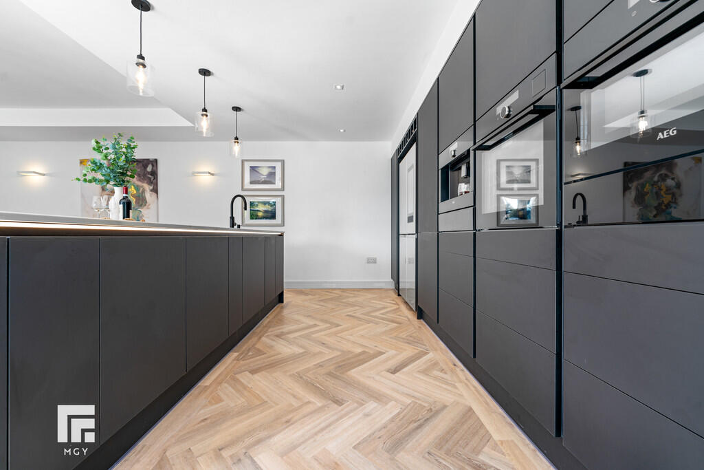 KITCHENANDFAMILYROOM32' 5" x 20' 0" (9.89m x 6.10m) A beautifully appointed new kitchen fitted with a wide range of base, eye level and full height units. Integrated AEG double oven and microwave (WiFi enabled), coffee machine and warming drawers. Plumbed for American style Samsung fridge/freezer (available by separate negotiation). Feature central island fitted with a range of base units incorporating one and a half bowl ceramic sink with "Quooker" hot water tap and soap dispenser, "Insinkerator" garbage disposal system and complementary Quartz worktop. AEG induction hob with built-in extractor fan, integrated Neff dishwasher (WiFi enabled). Bosch wine fridge and built in wine racks. Built-in bins. Spotlights. LVT flooring. Double glazed full width sliding doors to South facing front garden, with remote control blinds. Multi-fuel burner and back boiler with attractive exposed brick chimney stack and slate hearth.