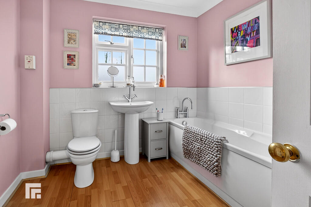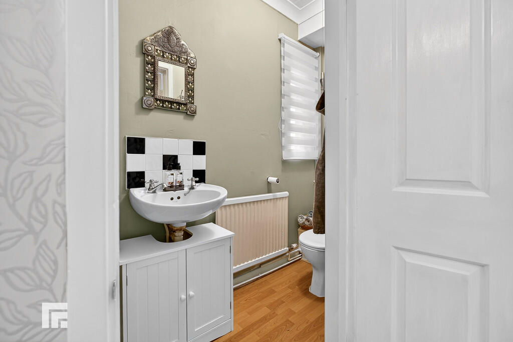 CLOAKROOM White suite comprising low level wc and wash hand basin. Tiled splashback. Laminate flooring. Window to side. Radiator.