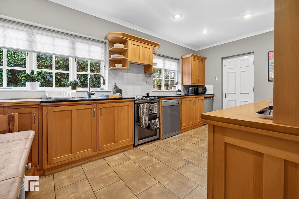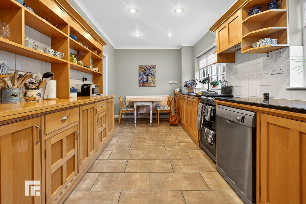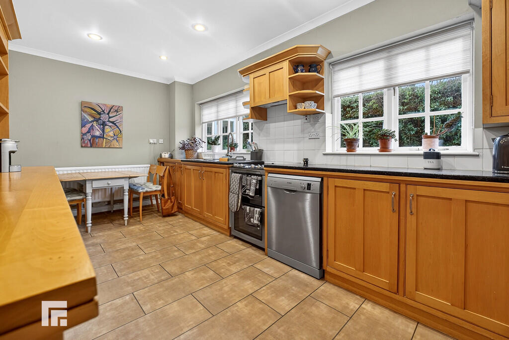 KITCHEN/BREAKFASTROOM17' 10" x 8' 11" (5.46m x 2.72m) Well appointed along two sides in Maple wood panelled fronts beneath a mix of granite and Maple wood worktops. Inset two bowl sinks. Freestanding cooker to remain with concealed cooker hood above. Plumbing for dishwasher. Space for under counter fridge or freezer. Two windows to rear. Tiled splash back. Door to side. Ample space for breakfast table. Radiator. Door to utility room.