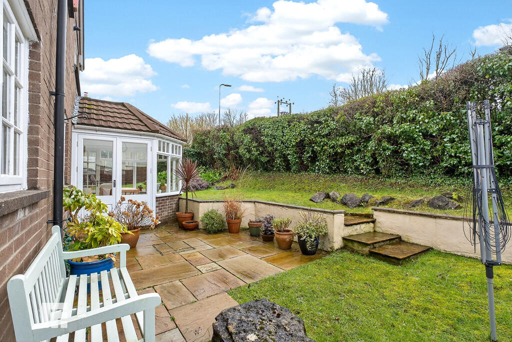REARGARDEN Enjoying a south westerly aspect paved patio leading onto an area of lawn. Area of lawn continuing to side access. Enclosed by hedgerow to rear boundary.