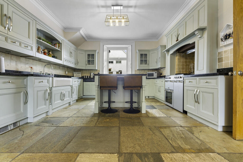 KITCHEN/DININGROOM26' 8" x 14' 6" (8.14m x 4.42m) A tastefully designed bespoke kitchen fitted with a range of base and eye level solid oak units, with ceramic sink and complementary granite work surfaces. Integrated dishwasher. Space for American fridge/freezer. Range cooker with extractor hood over. Central breakfast bar with granite work top. Tiled splash backs. Slate tiled flooring. The dining area includes feature fireplace with traditional tiled hearth and marble surround. Radiator. Double glazed bay windows to both side aspects. Glazed oak door to utility/games room.