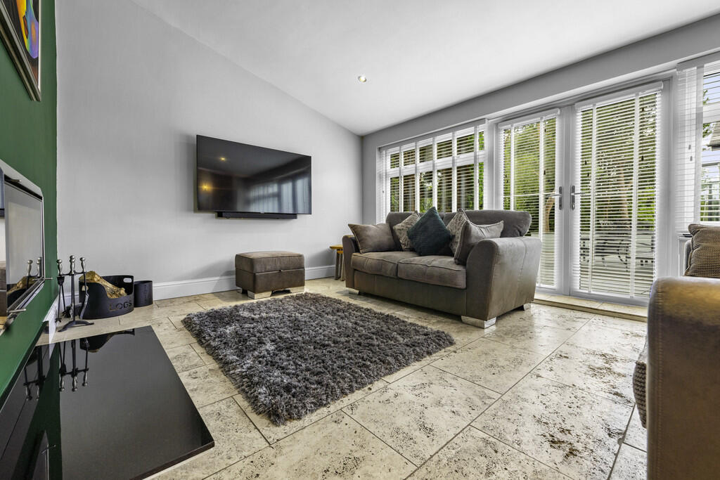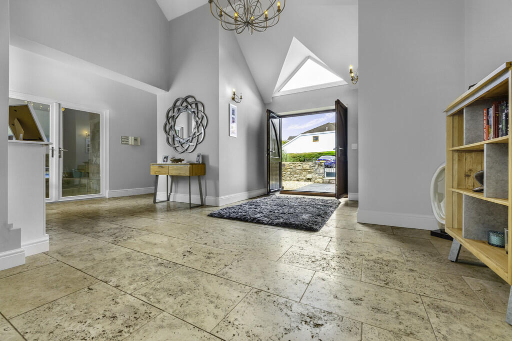 RECEPTIONHALLWAY Entered via feature double doors into hallway/lounge. Vaulted ceiling with double glazed window to front. Travertine tiled flooring. Door to WC and glazed double doors to indoor swimming pool/gym. Radiator. Open to:
