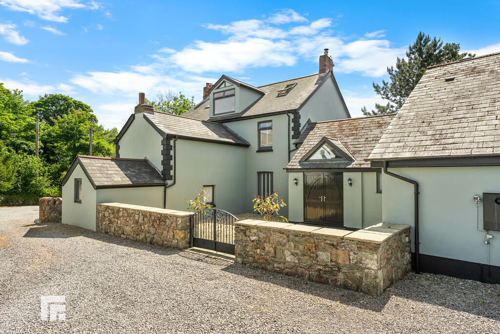 ENTRANCE Driveway leading to enclosed gated courtyard with boundary stone wall and slate tiled pathway to front door. Pebble borders. Additional gated access to large rear garden.