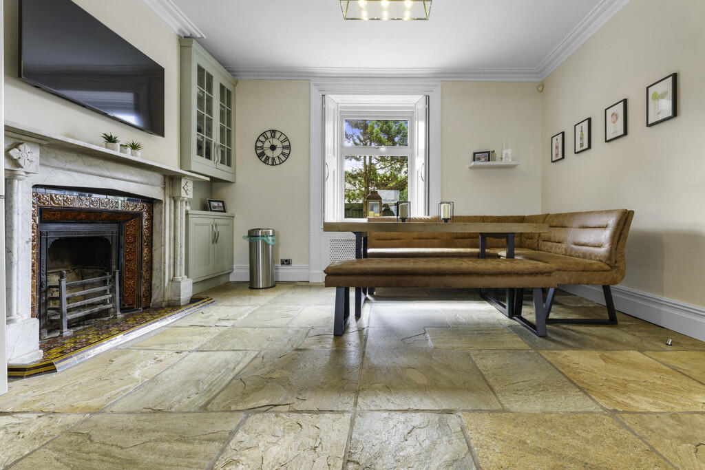 LOUNGE27' 4" ( to bay) x 13' 11" (8.35m x 4.25m) Travertine tiled flooring. Dual aspect with full height double glazed window and bay window to both sides. Two radiators. Solid oak wood door to inner hallway. Door to inner hallway.