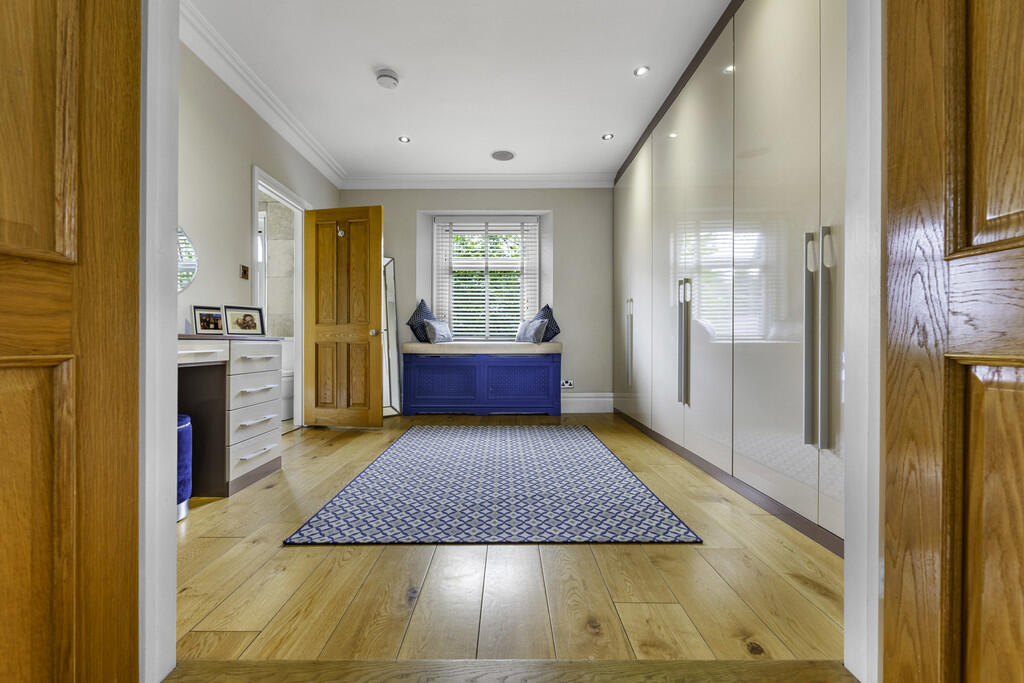 WALKINWARDROBE With a range of fitted wardrobes to two aspects. Wood flooring. Recessed spotlights.