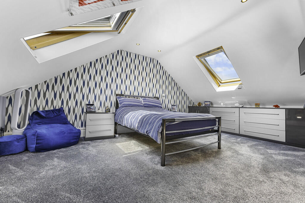 BEDROOMFOUR25' 9" x 17' 3" (7.85m x 5.26m) An excellent sized fourth double bedroom with electric velux windows to front and rear pitch. Fitted wardrobes and bedroom furniture. Eaves storage. Two radiators. Door to ensuite shower room.