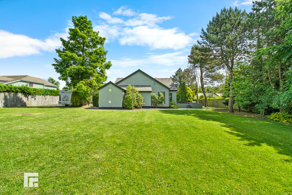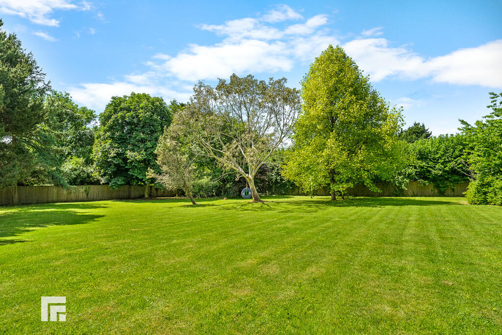 REARGARDEN Large paved patio relaxation/bbq and entertainment area leading onto an exceptionally generous manicured lawns with inset mature trees to boundaries and enclosed with timber fencing. Double opening gateway to side providing vehicular side access. Workshop/Shed located at the bottom of the garden with water and electricity.