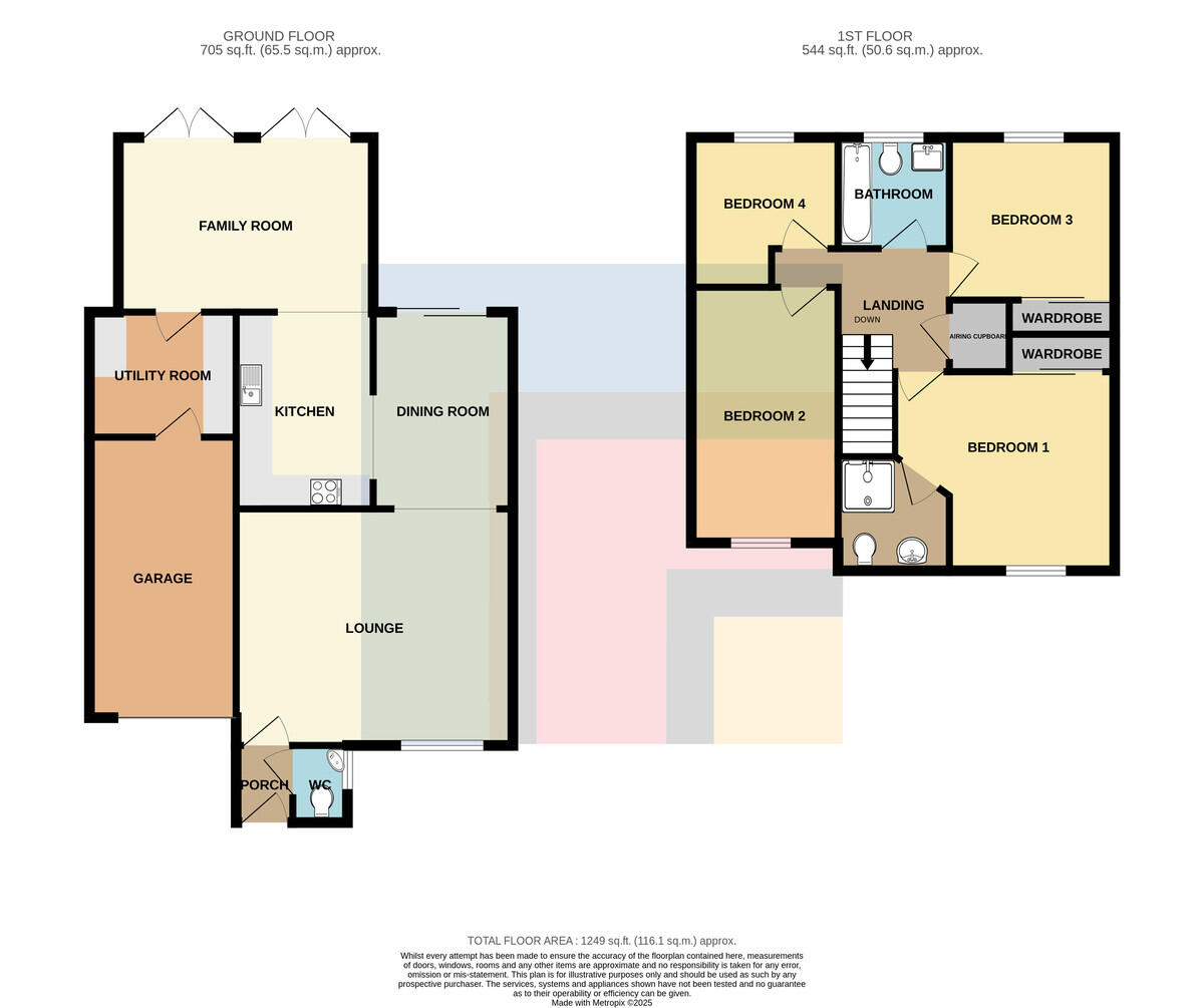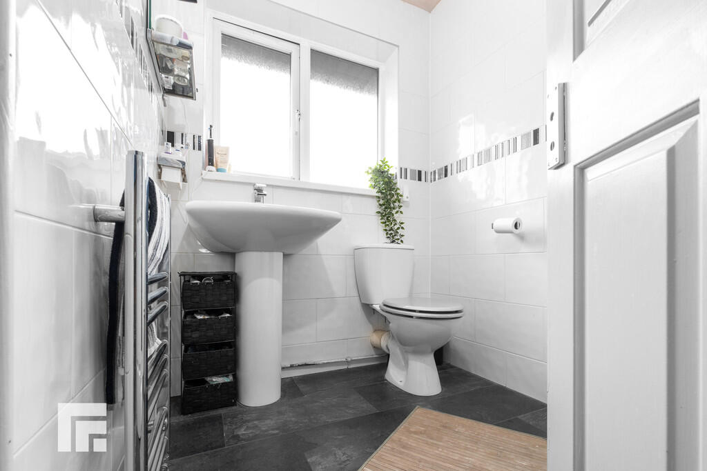 FAMILYBATHROOM6' 0" x 6' 0" (1.85m x 1.85m) Modern white suite; low level WC, pedestal wash hand basin with chrome mixer tap, bath with chrome mixer tap and hand shower. Tiled walls and flooring, uPVC obscured glass window to rear.
