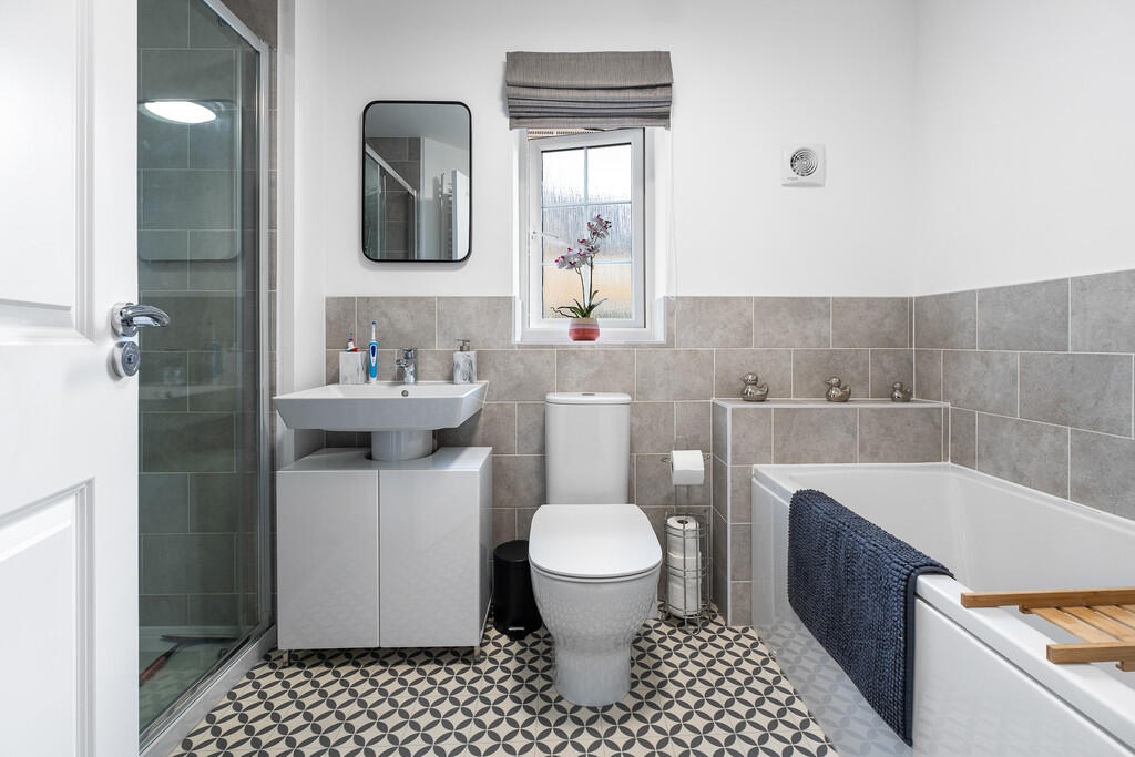 ENSUITE7' 6" x 5' 8" (2.29m x 1.73m) The suite comprises low level WC, pedestal wash hand basin and double shower cubicle with sliding glass door. Tiled splash backs. uPVC double glazed window to front. Ladder radiator. Extractor fan.