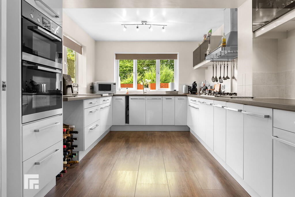 KITCHEN18' 9" x 9' 10" (5.74m x 3.0m) Appointed along three sides, eye and low level cupboards beneath quality laminate worktops. Stainless steel 1.5 bowl sink with chrome mixer tap and side drainer. Integrated five ring gas hob with extractor hood and stainless steel splashback. Integrated oven, integrated grill and space for American fridge/freezer. uPVC window to side and rear. Quality flooring. Doors to dining room, hallway and utility room.