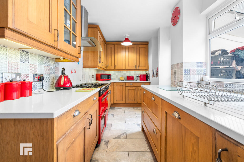 KITCHEN16' 2" x 6' 2" (4.94m x 1.88m) Well appointed along three sides in woodgrain finish fronts beneath quartz worktop surfaces. Inset 1.5 bowl stainless steel sink with worktop side drainer. Space for range style cooker. Integrated bin storage. Integrated dishwasher. Cupboard housing the 'Worcester' gas central heating boiler. Window to rear. Tiled flooring. Radiator. Door to rear utility.