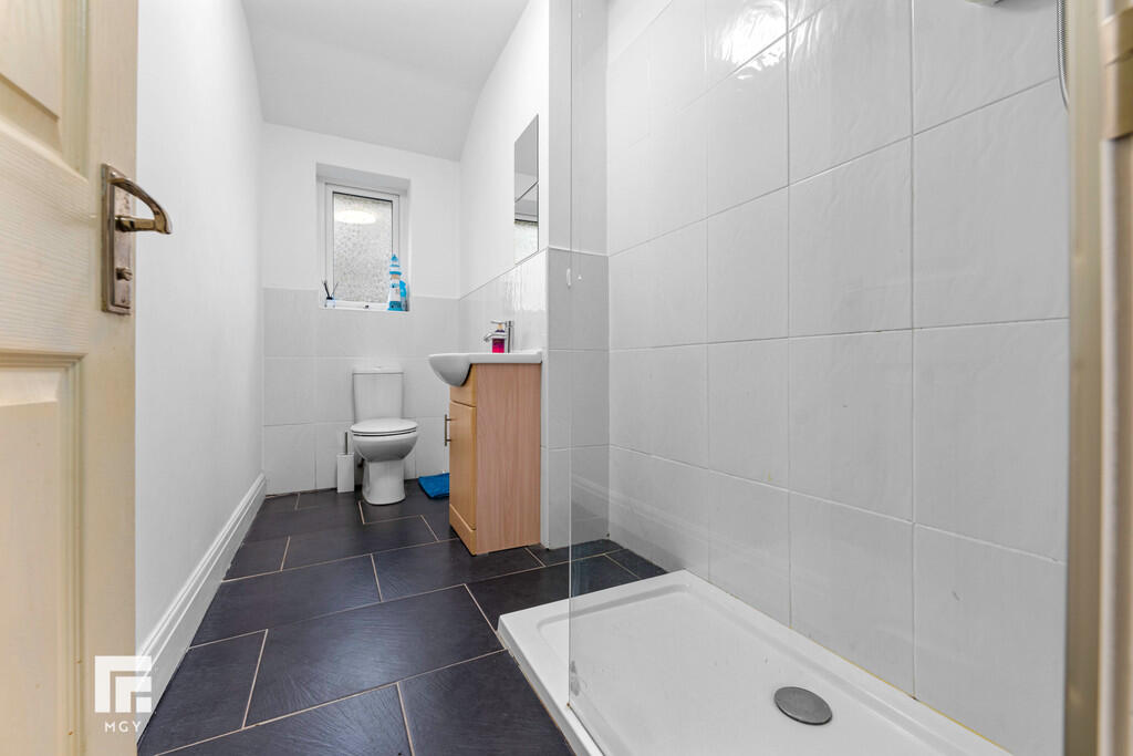 EN-SUITE7' 6" x 4' 11" (2.30m x 1.50m) Low level WC, vanity enclosed wash hand basin and walk-in shower with electric shower over and glass screen. Radiator. Tiled flooring and splash backs. Shaver point. Spotlights. Extractor fan. uPVC double glazed window to rear.