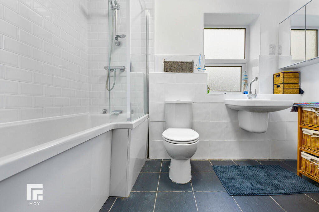 BATHROOM9' 4" x 5' 10" (2.85m x 1.80m) A modern suite comprising low level WC, floating wash hand basin and panelled P-bath with mixer shower over and glass screen. Tiled flooring and splash backs. Radiator. Shaver point. uPVC double glazed window to rear.