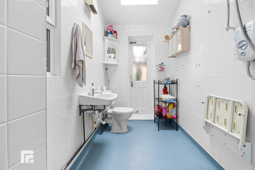 DOWNSTAIRSSHOWERROOM8' 6" x 4' 9" (2.61m x 1.47m) Tiled flooring and vinyl flooring. Window to side aspect. Wet room with electric shower above, wall mounted sink with hot and cold tap over and WC. Wall mounted mirrored cabinet. Velux window. Extractor fan. Door to rear garden.