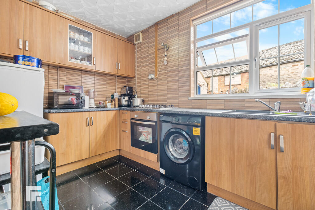 KITCHEN10' 11" x 7' 4" (3.33m x 2.26m) Tiled flooring and fully tiled walls. Range of wall, base and drawer units with round edged worktops over incorporating 1.5 sink with draining board and mixer tap over and five ring gas hob with extractor fan above and oven beneath. Space for appliances. Tiled splashbacks. Pendant light fitting. Window to rear aspect. Door leading to rear garden. Radiator.