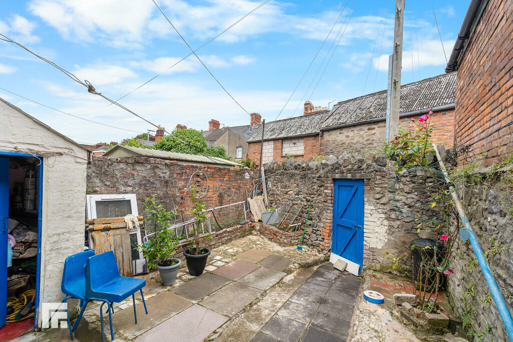 Rear - Laid to patio. Wall border. Mature plants and shrubs. Storage shed with WC. Pedestal wash hand basin. Outside tap.