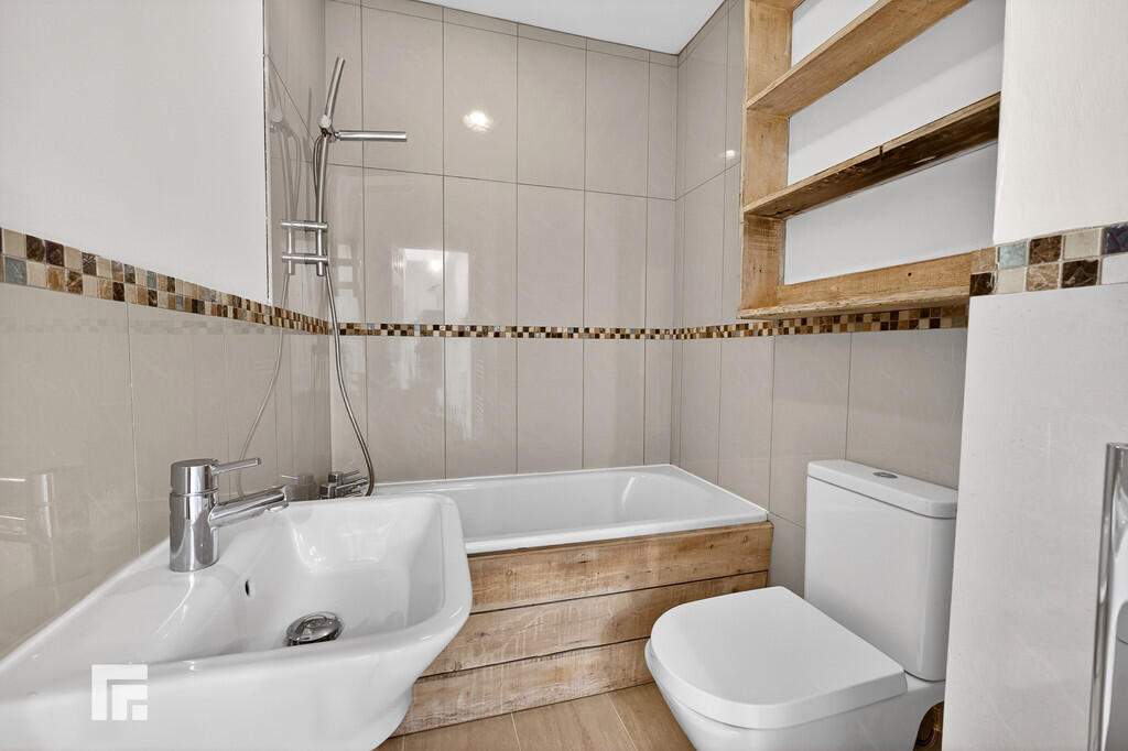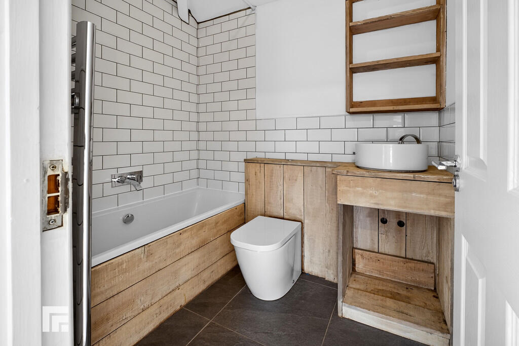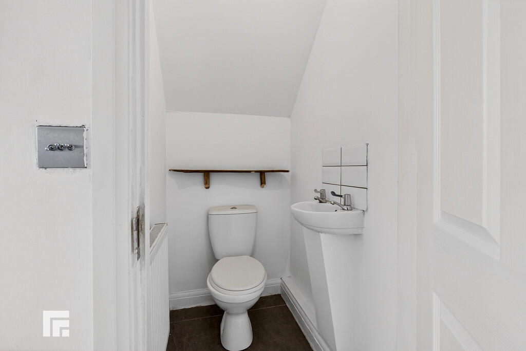 WC3' 8" x 3' 2" (1.12m x 0.99m) Low level WC and wash hand basin with tiled splash back and flooring. Radiator.