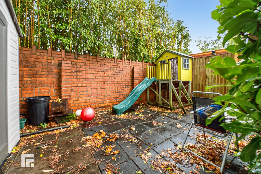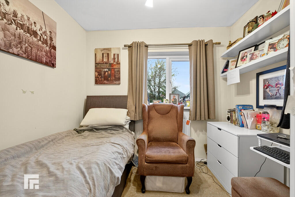 Rear Garden- Fully enclosed rear garden, mostly lawned, bordered by fencing and a wall. Patio area. Central pathway to a second patio area at the end of the garden. Outhouses. Space for shed (negotiable).