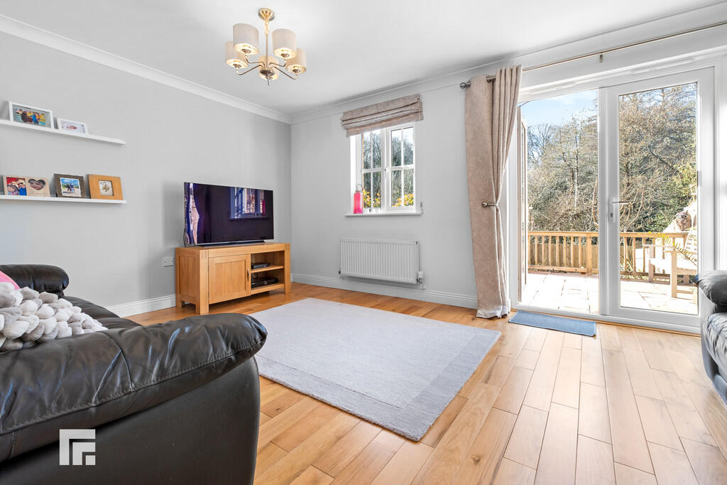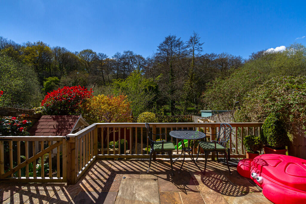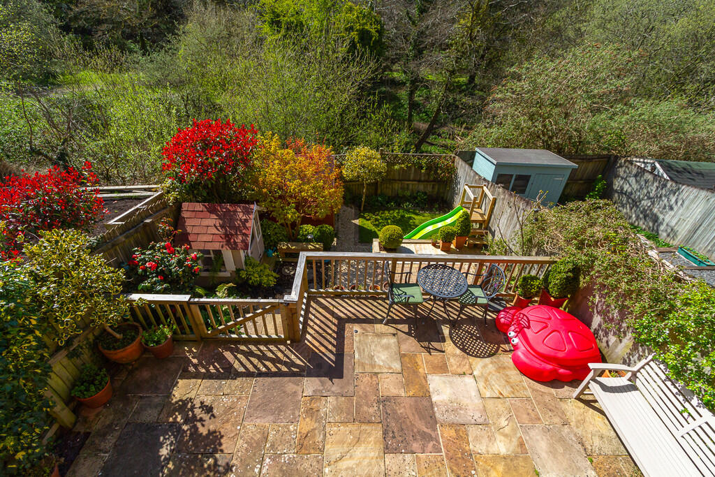 REARGARDEN Beautifully presented, West facing rear garden offering full width paved patio off the lounge with wooden balcony and woodland views beyond. The landscaped lower level includes hard and soft landscaping, garden bark chippings, garden pebbles and tegula block setts and shrub borders. Boundary fence. Outside tap.