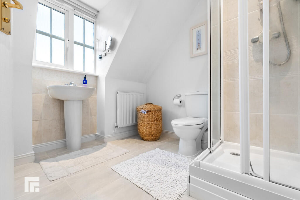 EN-SUITE8' 2" x 7' 7" (2.51m x 2.33m) uPVC obscure double glazed window to rear. Part tiled walls and tiled flooring. Low level wc. Pedestal wash hand basin. Corner shower cubicle. Shaver point. Extractor fan. Radiator. Spotlights.