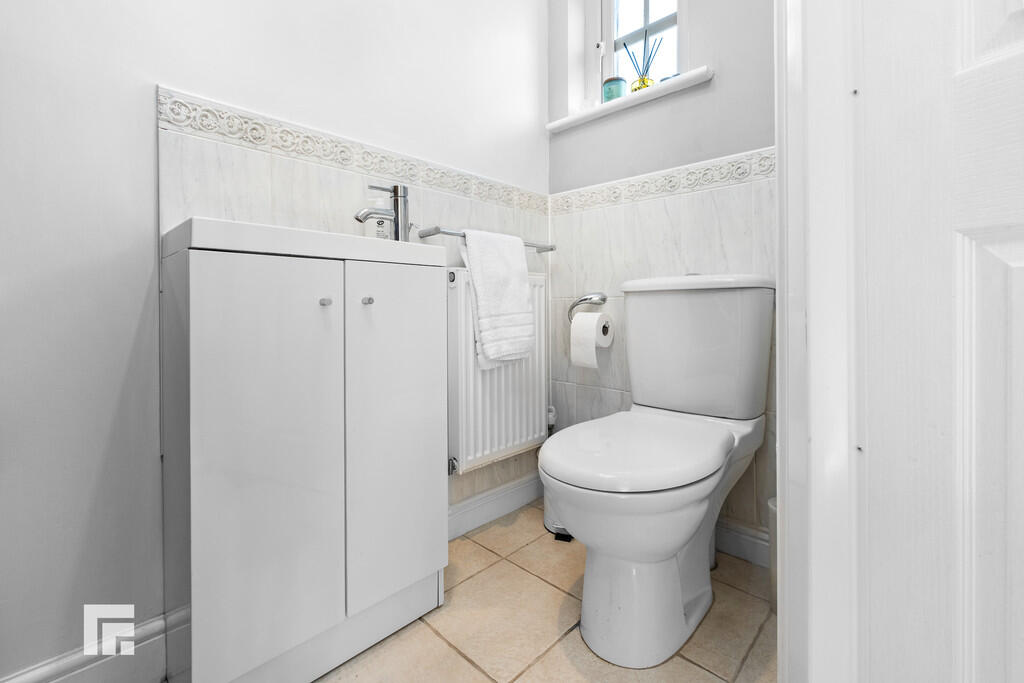 CLOAKROOM uPVC obscure double glazed window to front. Low level WC. Tiled flooring. Part tiled walls. Vanity enclosed wash hand basin. Storage shelving. Radiator.