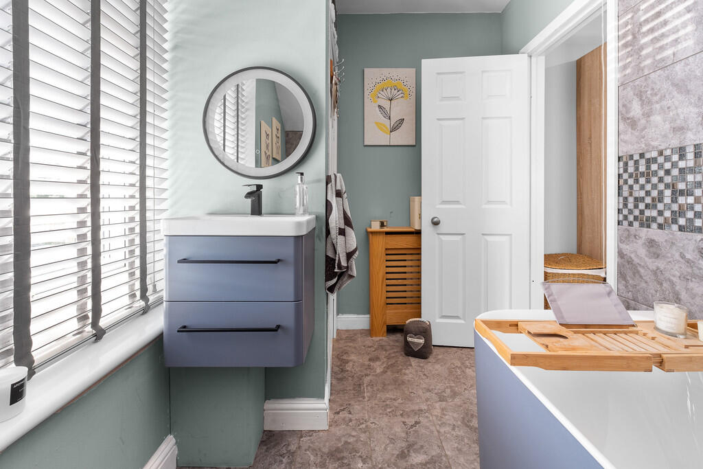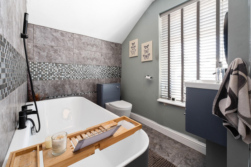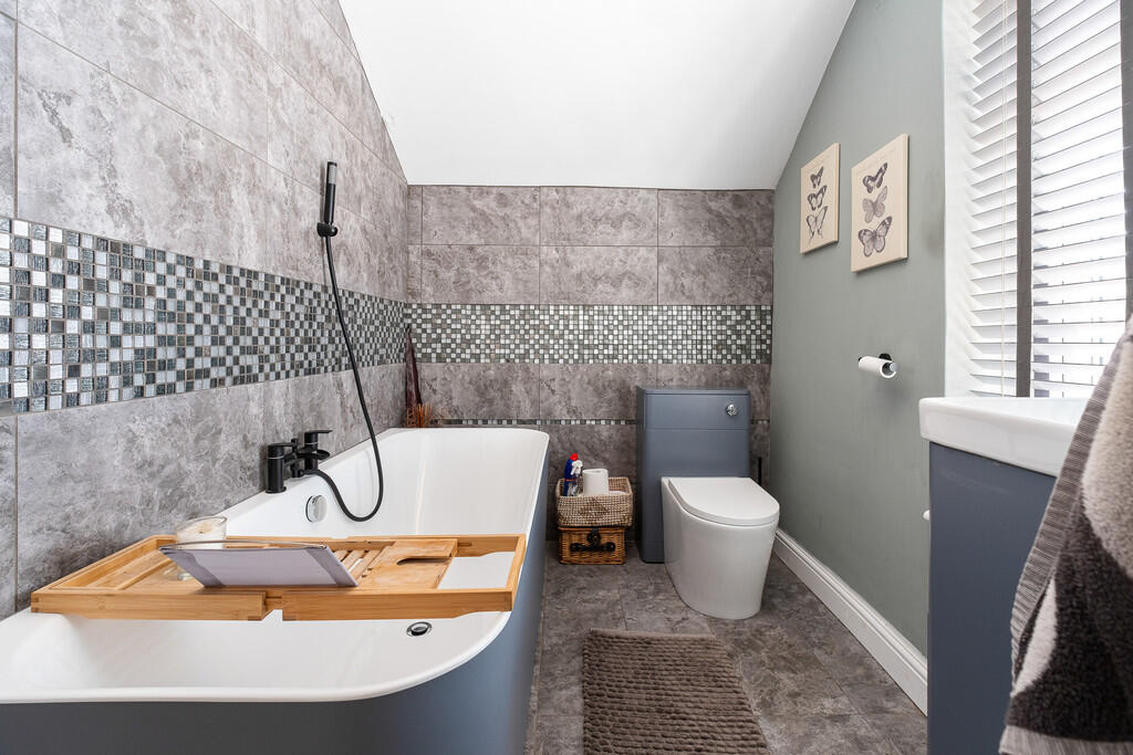 EN-SUITE Tiled flooring and partially tiled walls. WC. Oval bath with hot and cold tap over and shower attachment above. Vanity wash hand basin with mixer tap over and storage beneath. Extractor. Radiator with cover. Obscure double glazed uPVC window to rear aspect with fitted blinds. Door to storage cupboard.