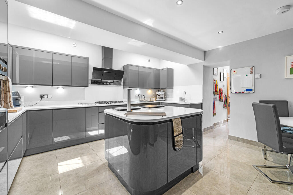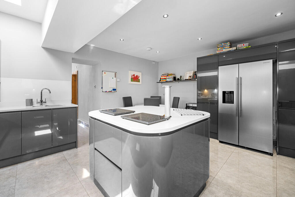 KITCHEN/DINER16' 3" x 14' 10" (4.96m x 4.54m) Modern fitted 'Wren' kitchen with a range of wall, base and drawer units with worktops over incorporating gas hob with extractor above and inset 1.5 sink with hot and cold tap over. Integrated dishwasher, fridge and two ovens. Space for large fridge/freezer. Central island with worktops over and ample storage beneath. Tiled flooring with underfloor heating. Spotlights. Under counter lighting. Two skylights with rain sensors. Power points. Space for dining table and chairs. Opening to hallway leading to family room, utility room and downstairs shower room.