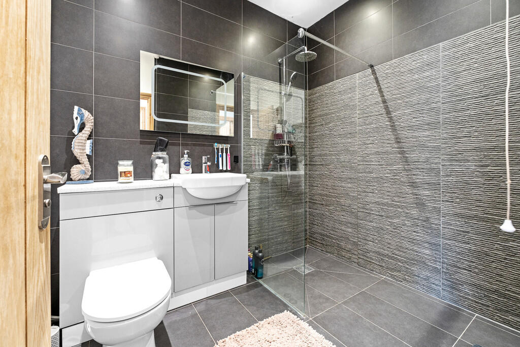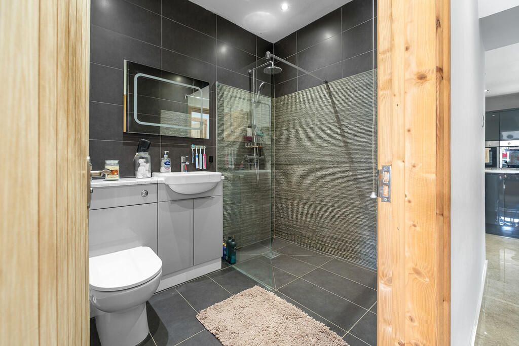 SHOWERROOM Tiled flooring with underfloor heating. Tiled walls. WC. Vanity wash hand basin with mixer tap above and storage beneath. Wall mounted LED light mirror. Spotlights. Walk in double shower cubicle with mains powered shower over. Extractor.