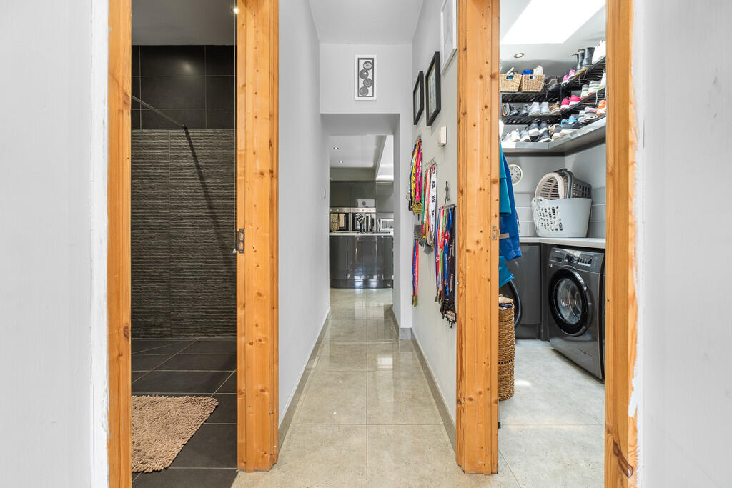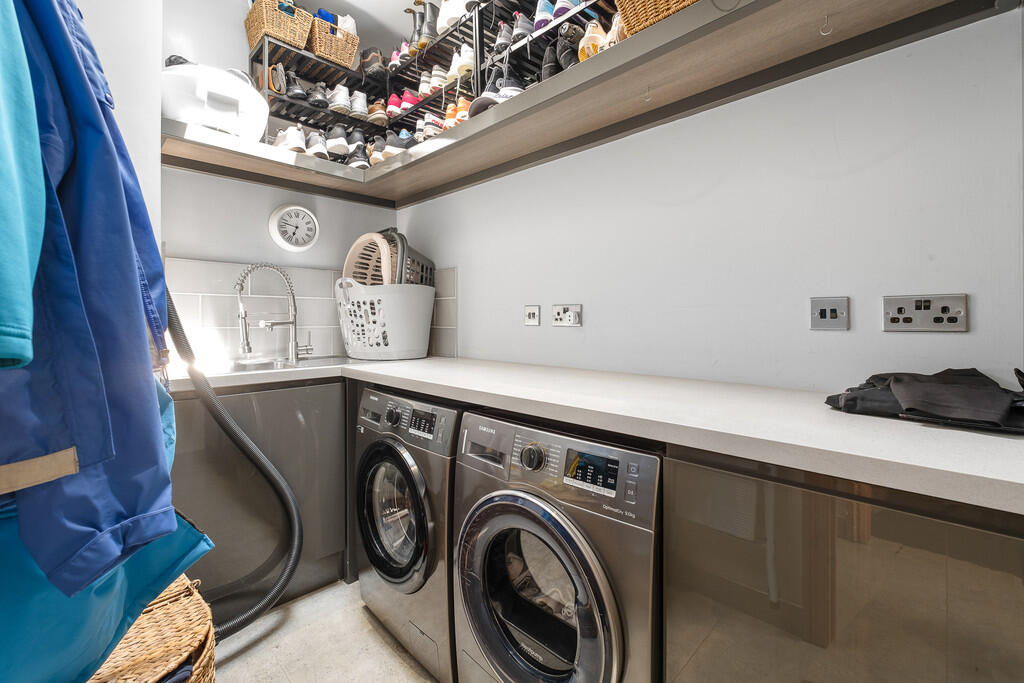 UTILITYROOM Continuation of tiled flooring with under floor heating. Base units with worktops over incorporating inset sink and tap over. Tiled splashback. Space and plumbing for washing machine and tumble dryer. Power points. Shelving. Skylight. Spotlights.